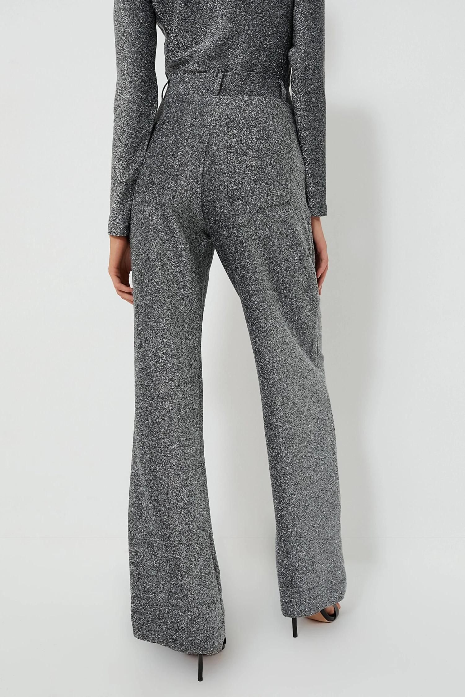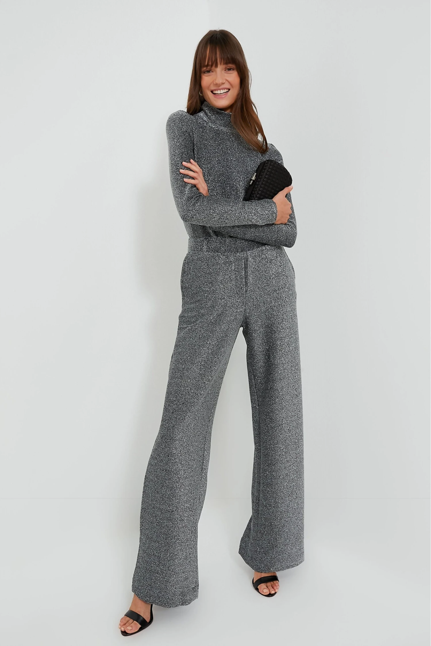 Shine bright in the Shimmer Gray Jya Pant by Baum Und Pferdgarten! These have a classic straight-leg trouser silhouette that is elevated with stretchy, glittery fabric. Featuring an elasticized waistband, pockets at the sides and back, and belt loops at the waist, these are the perfect bottoms to wear to your next event or to dress up your office wardrobe.Â