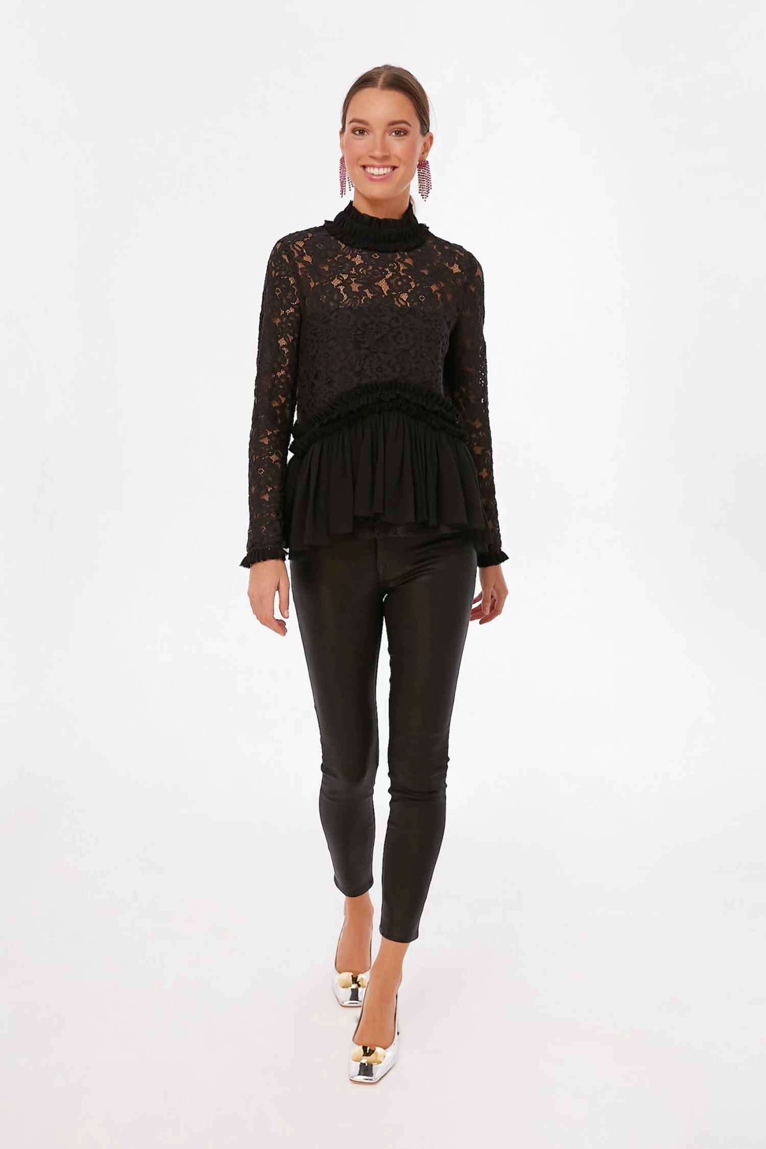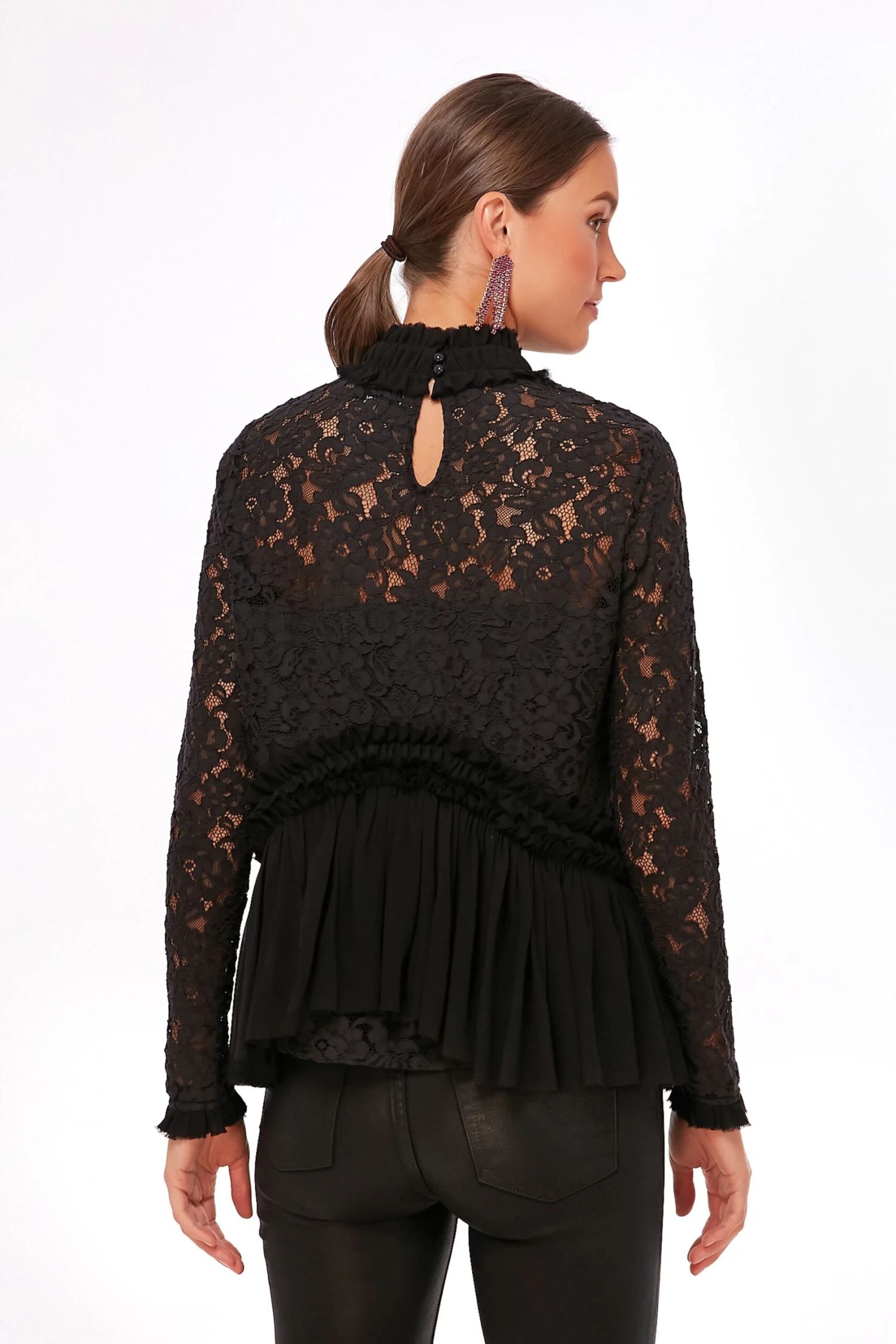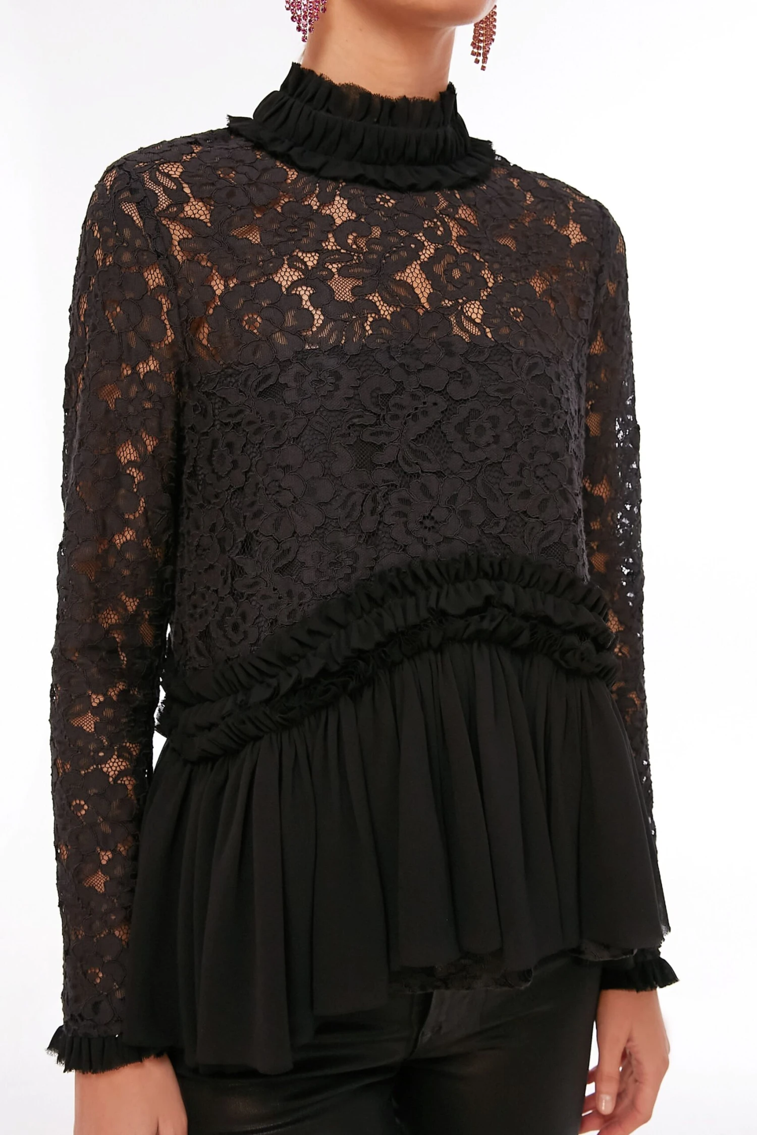 Oo-la-la, we cannot get enough of the Black Lace Myla Top. Ruffles and lace details come together for the perfect feminine silhouette and a drop waist adds movement to this flirty number. In an allover sleek black colorway, this glamorous style pairs well with everything from leather trousers to mini skirts. Perfect for office holiday parties or festive celebrations with friends and family, you are sure to be the best dressed.