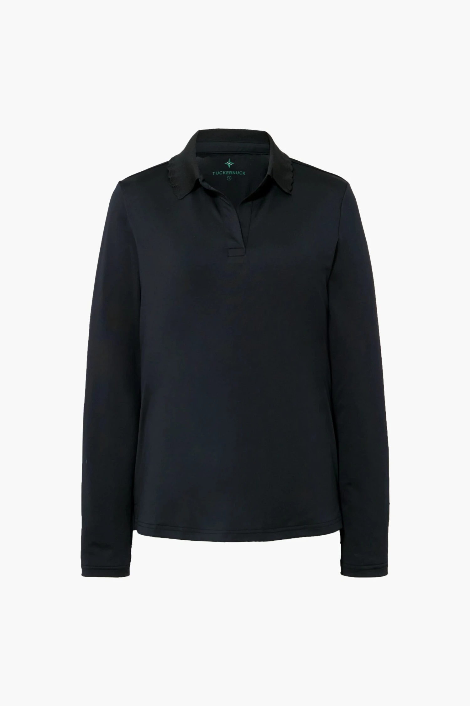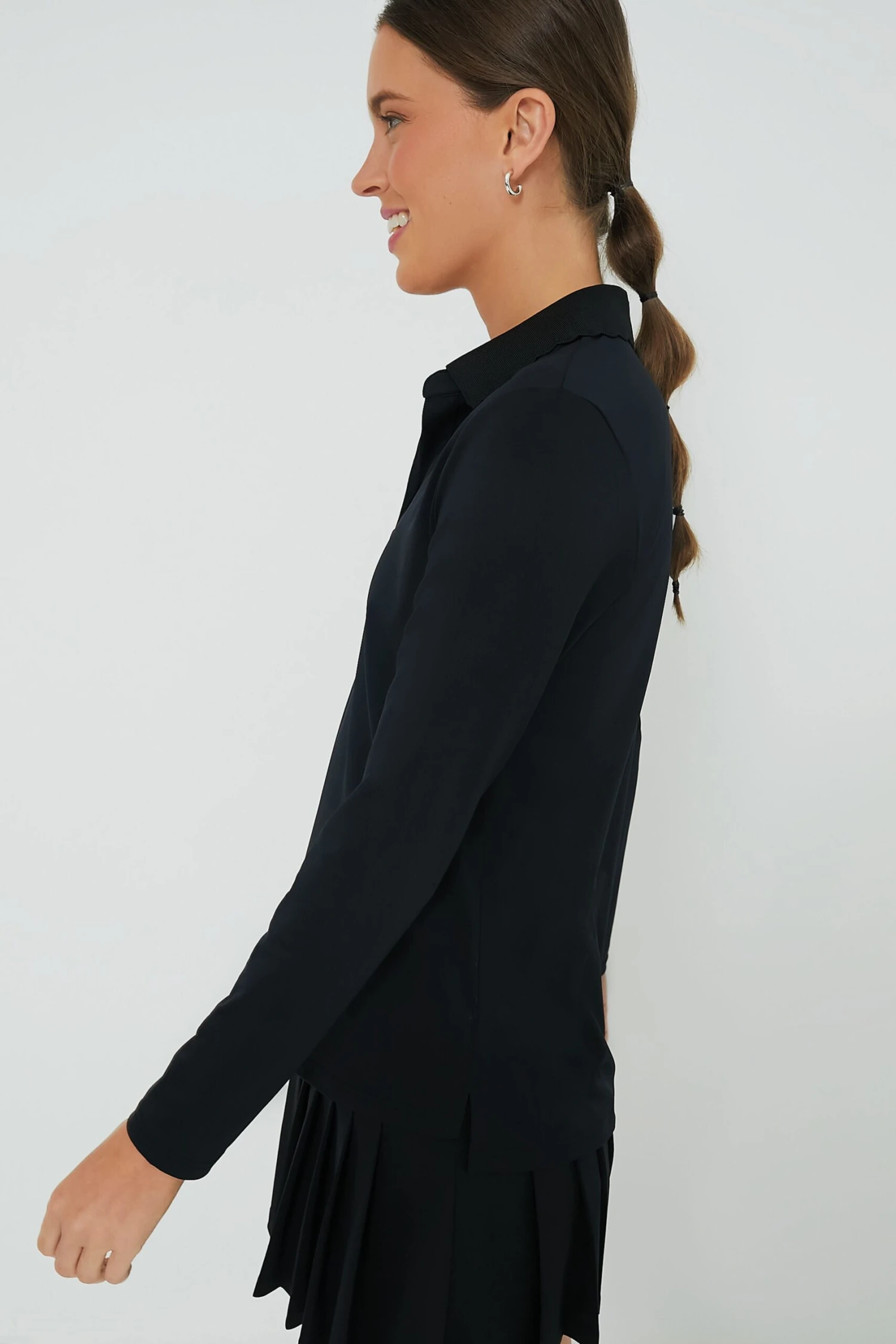 The Black Long Sleeve Caroline Polo is a classic look with modern tailoring. Feminine scallops adorn the edge of the collar in a classic black, creating a chic moment to finish out this all activities top. Featuring an V-neckline, boxy fit, and an ideal length for tucking with ease, this piece keeps it cool even when the match gets hot. We designed this with tennis and golf in mind, but it works well for a power walk or pickleball match too!