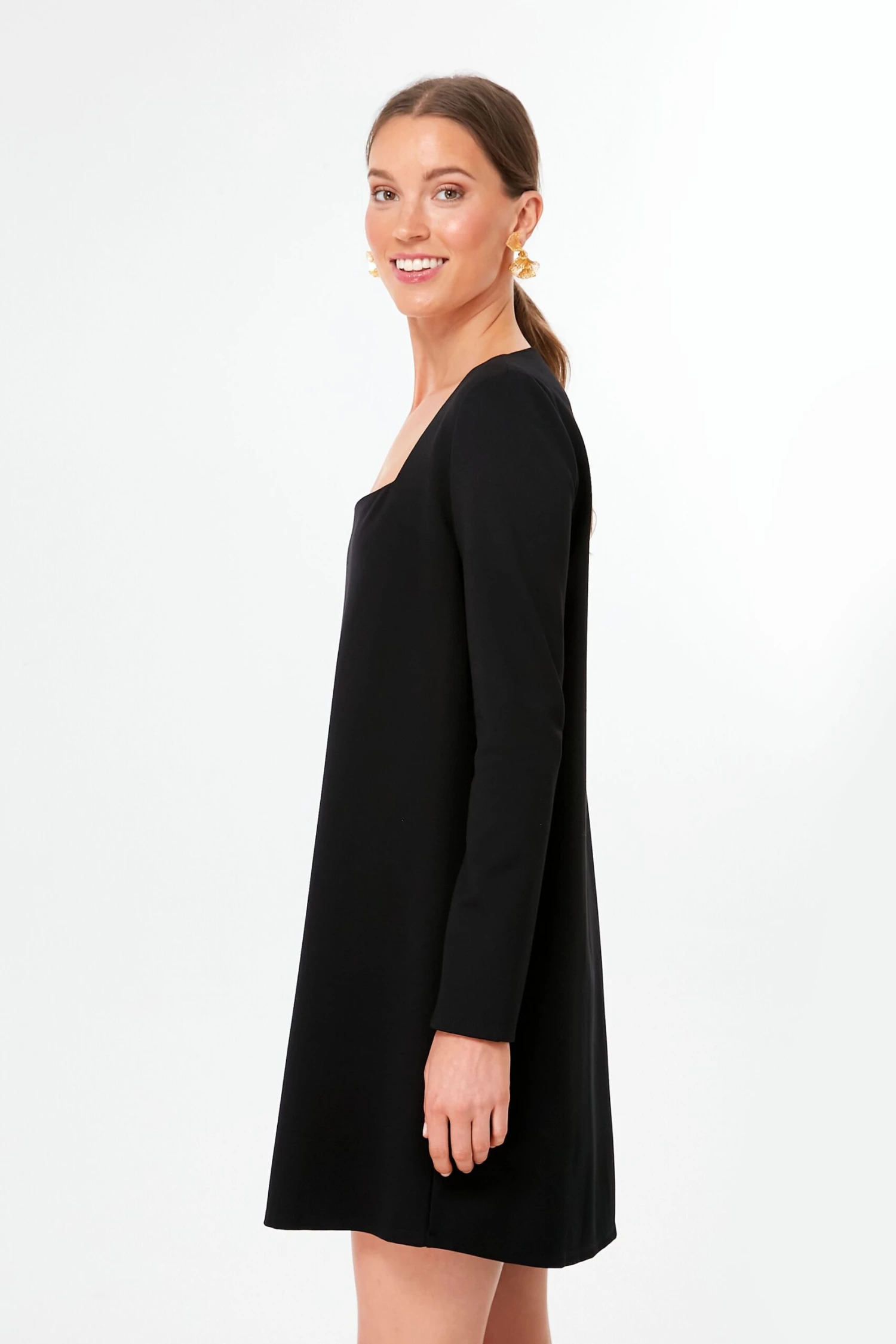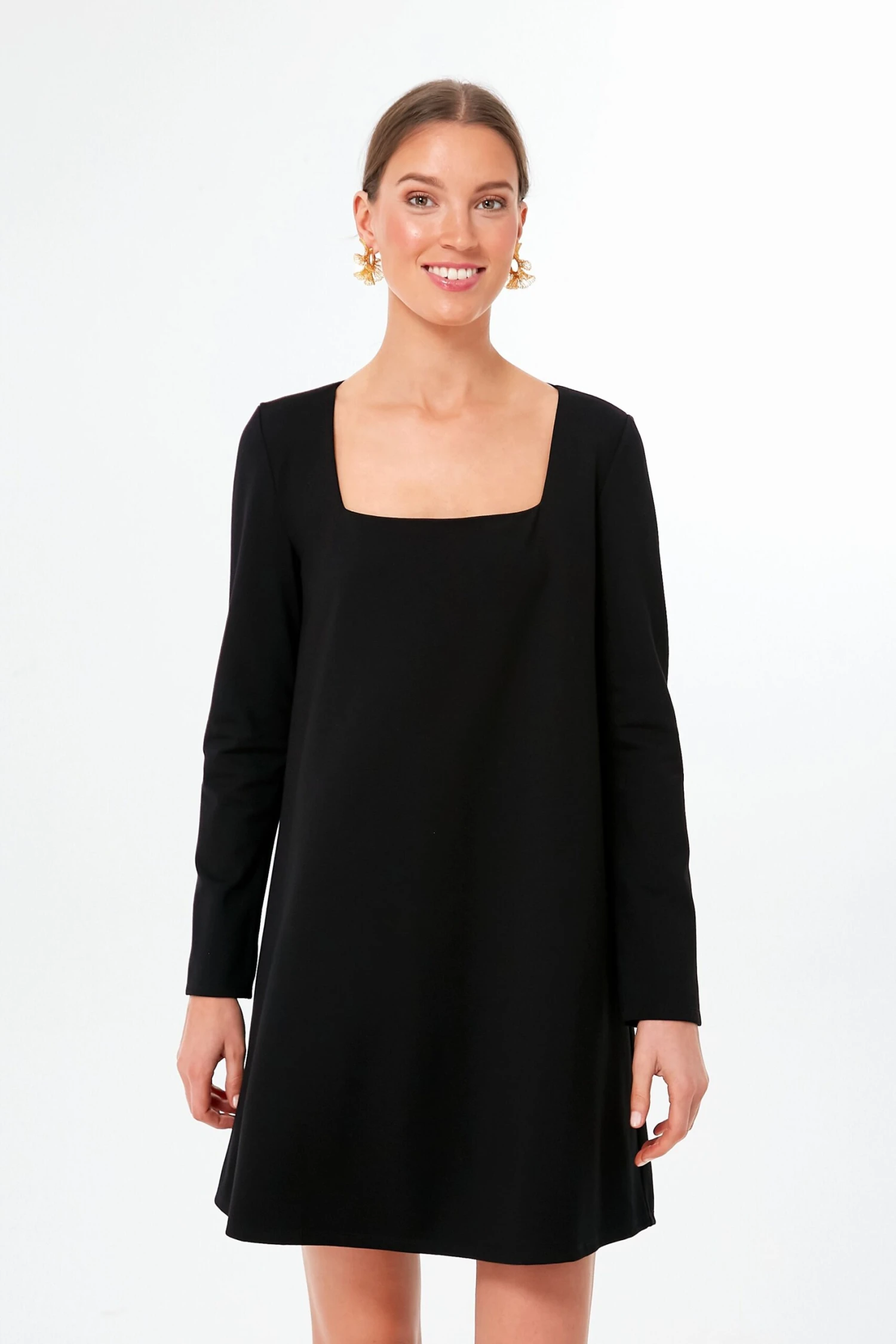 Inspired by none other than style icon Kate Middleton, the Black Middleton Dress does not disappoint when it comes to royal inspired dressing. Embodying the Princess of Wales’ trademark fashion choices, this little number is classic, timeless, and tailored. Cut with a square neckline designed to accentuate your décolletage in a flattering yet tasteful way and long sleeves for modest contrast, this not too short, not too long mini fully embodies unfussy femininity. For a twist, add a pop of color with your shoe choice and gold accessories for an updated and on-trend look.