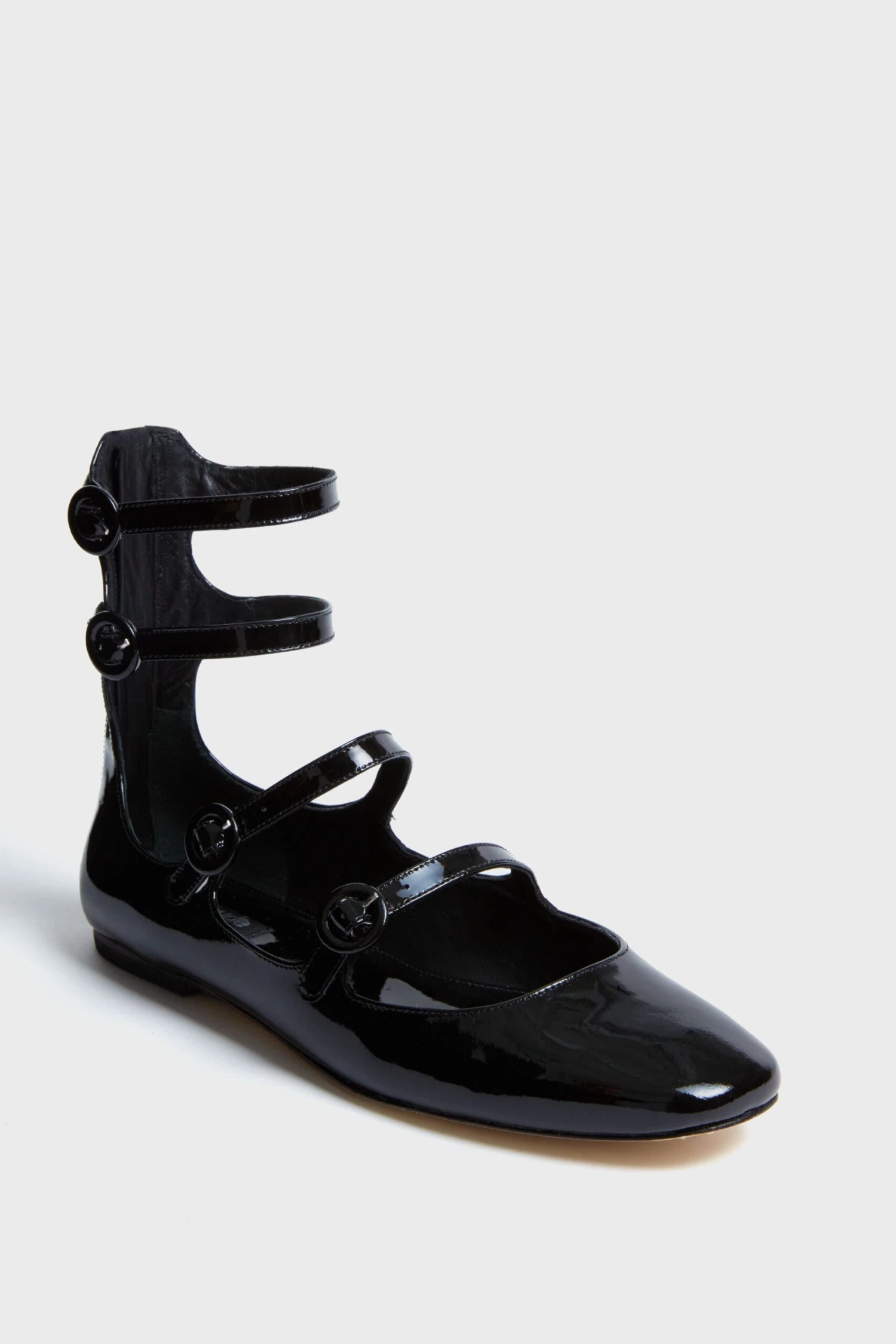 Based off of a classic ballet flat, the Alex Flats are elevated to the next level with a striking patent leather and straps that tie up the ankle. Blending a feminine silhouette with daring and bold details, these are a closet standout. Complete with a back zip closure, adjustable buckles, and a memory foam insole, these will be your next tried and true favorites.Â