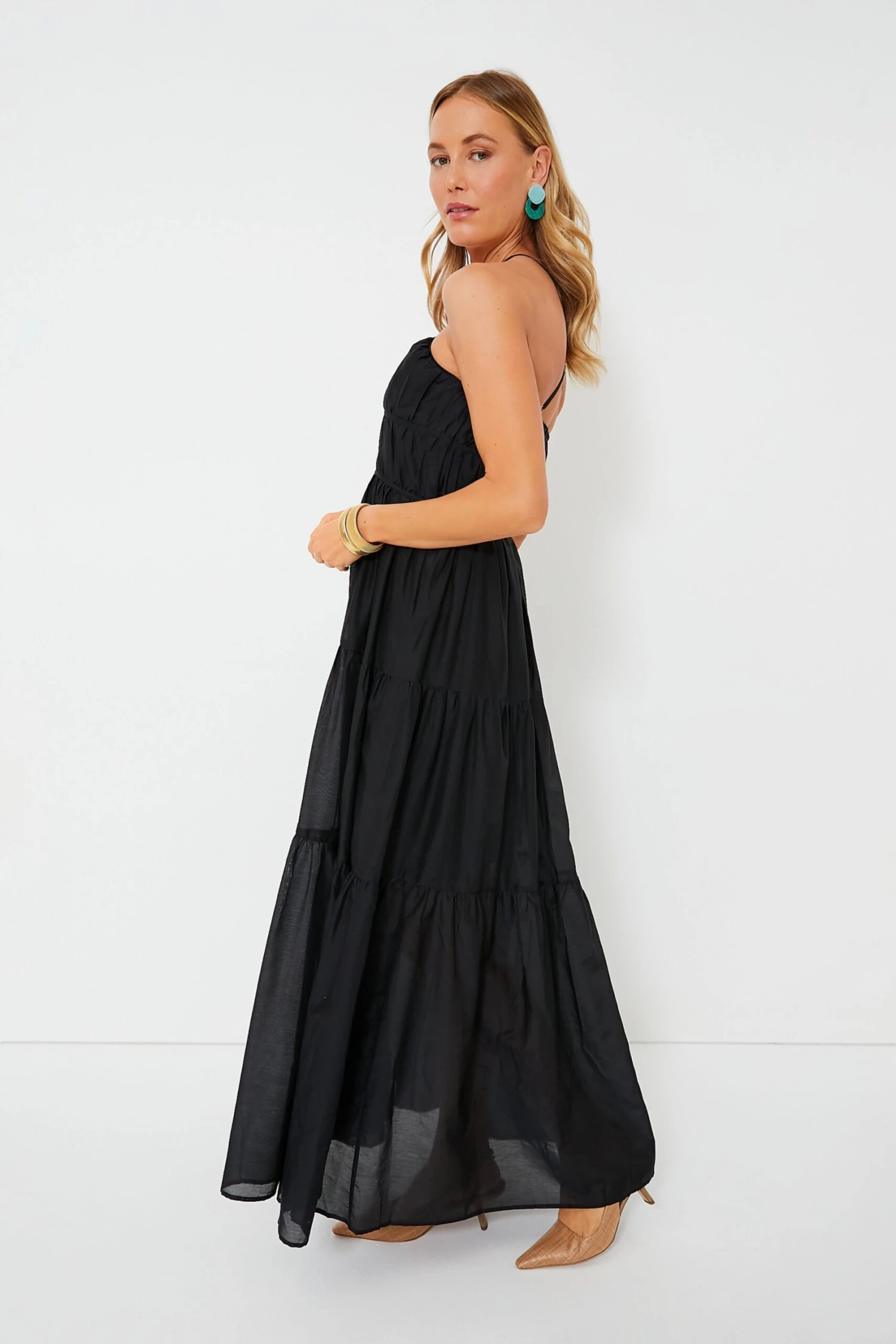 The Black Seraphina Maxi is a perfect party and event dress that you will find yourself wearing time and time again. A gently ruched bodice, flowing tiered maxi skirt, and criss-cross spaghetti straps create an ultra-flattering shape that can easily be styled for the occasion. Pair with heels and gold jewelry for a cocktail hour, or with sandals and a crossbody for a beachside dinner.Â