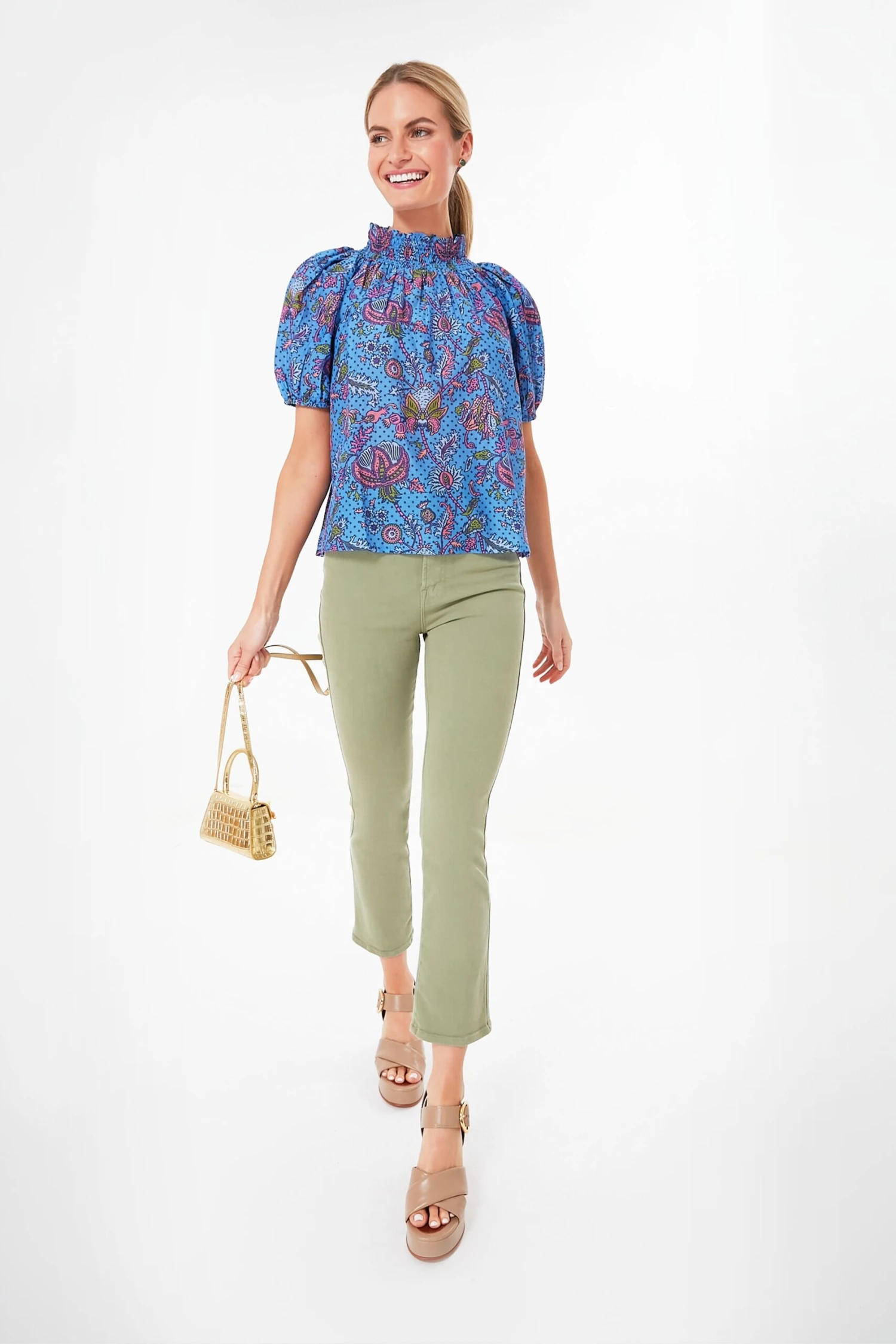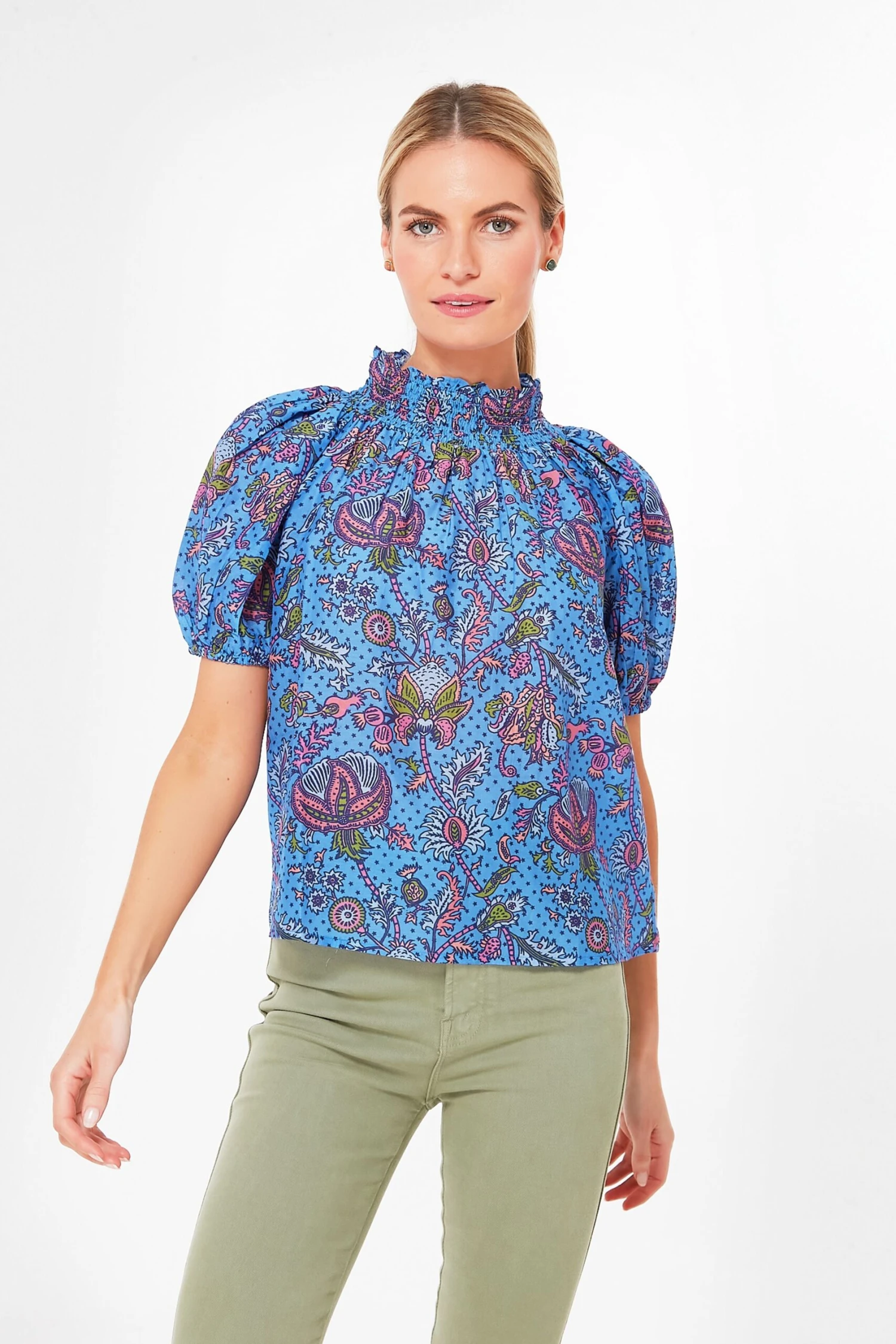 You’ll be feeling blue (in a good way) with the Amanda Star Ansley Top. This paisley printed cotton silk pullover features a high elastic smocked neck and short sleeves. It’s perfect for layering throughout the season and hits right at the hip for true versatility. Pair with denim, trousers, leggings, the possibilities are endless for this chic, cutesy number.