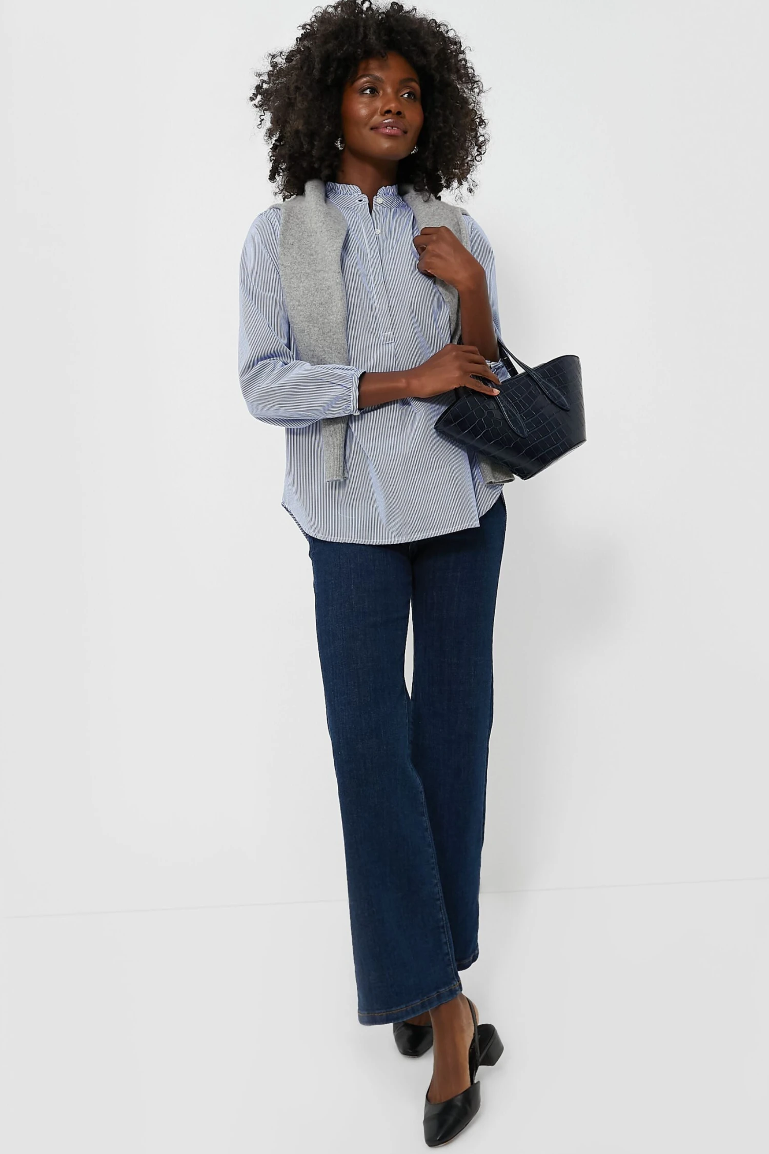 Effortless yet put-together, the Blue and White Stripe Sara B Henley is a twist on the classic button-down. Feminine and casual, this top features a standup ruffle collar and a hidden button placket. Pair with denim and flats for work or brunch with friends.