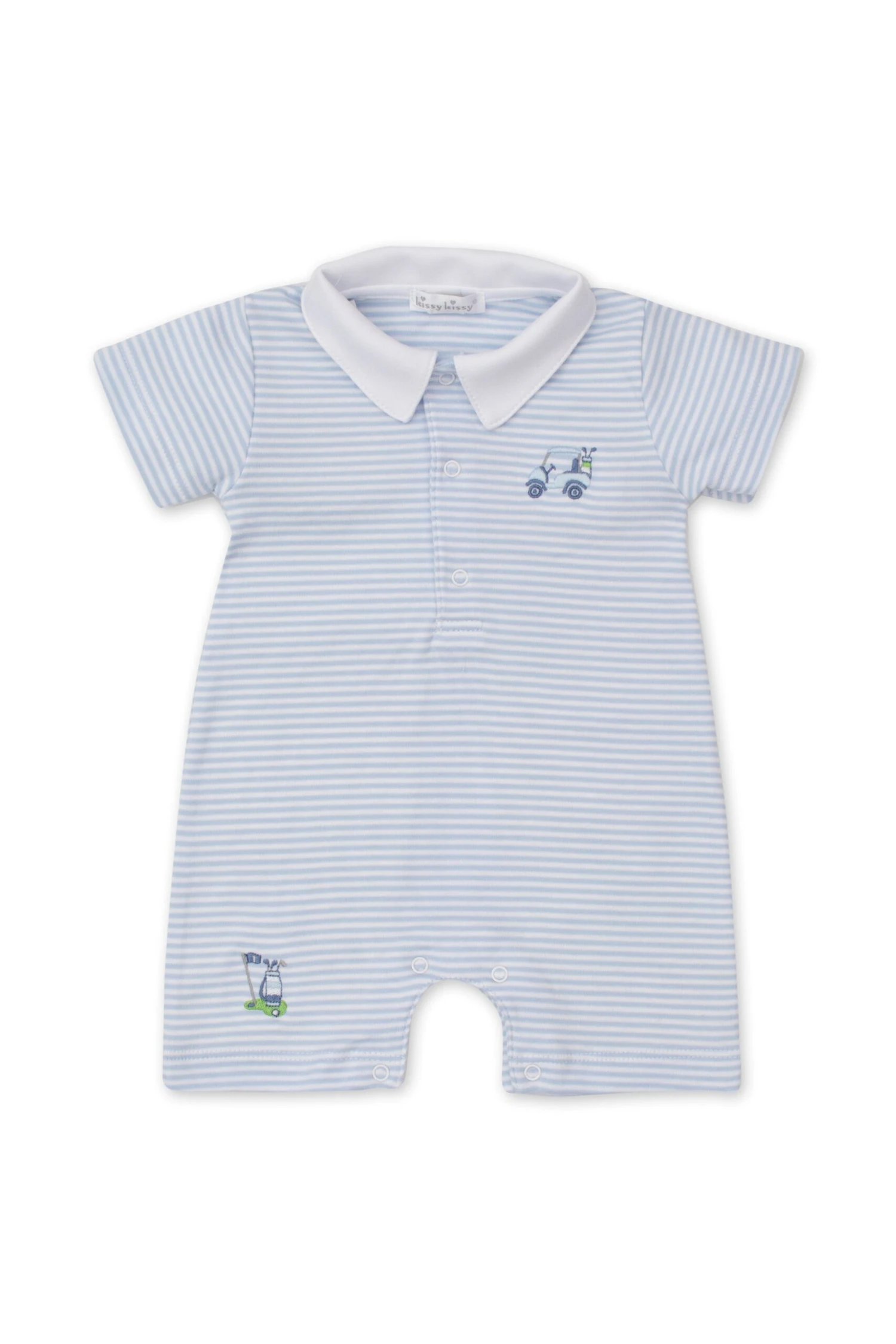The Blue Hole In One Playsuit will provide your little one with the utmost comfort no matter what they are up to. With classic blue and white pinstripes as well as adorable little embroidered golf motifs, this ultra-soft number features a sweet collared neckline and snaps between the legs for easy changing. Made from pima cotton, this is an item that you can feel great about putting your kiddo in.