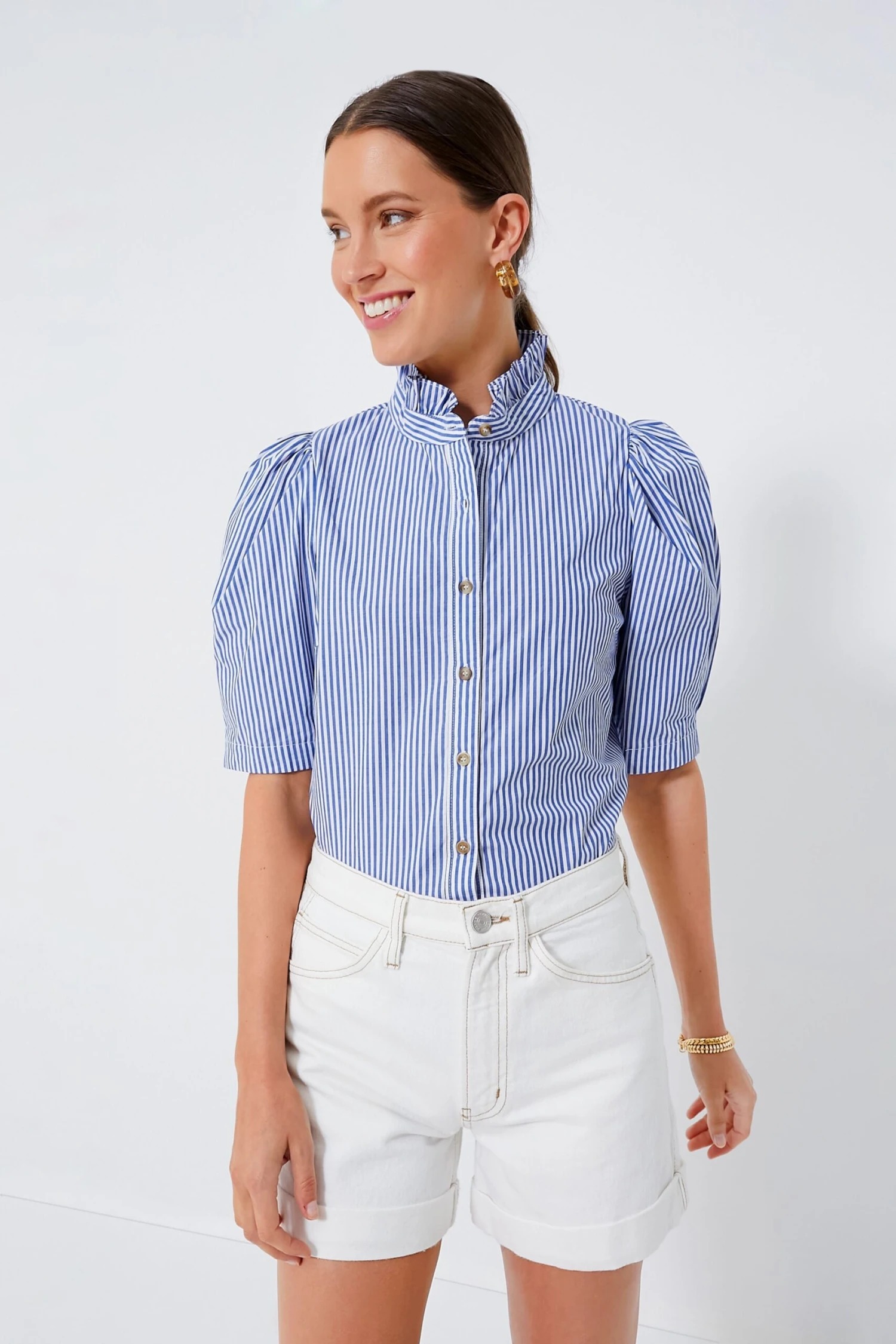 The Alicia Blouse is defined by it’s puff sleeves, ruffled stand collar, and always on-trend blue and white stripes. Cut in the perfect length that looks great tucked in or left out, this effortlessly polished piece is great for year round wear thanks to its versatile styling options. Pair this feminine number with white denim during the warmer months and opt for trousers and a sweater layered on top for the cooler ones.Â
