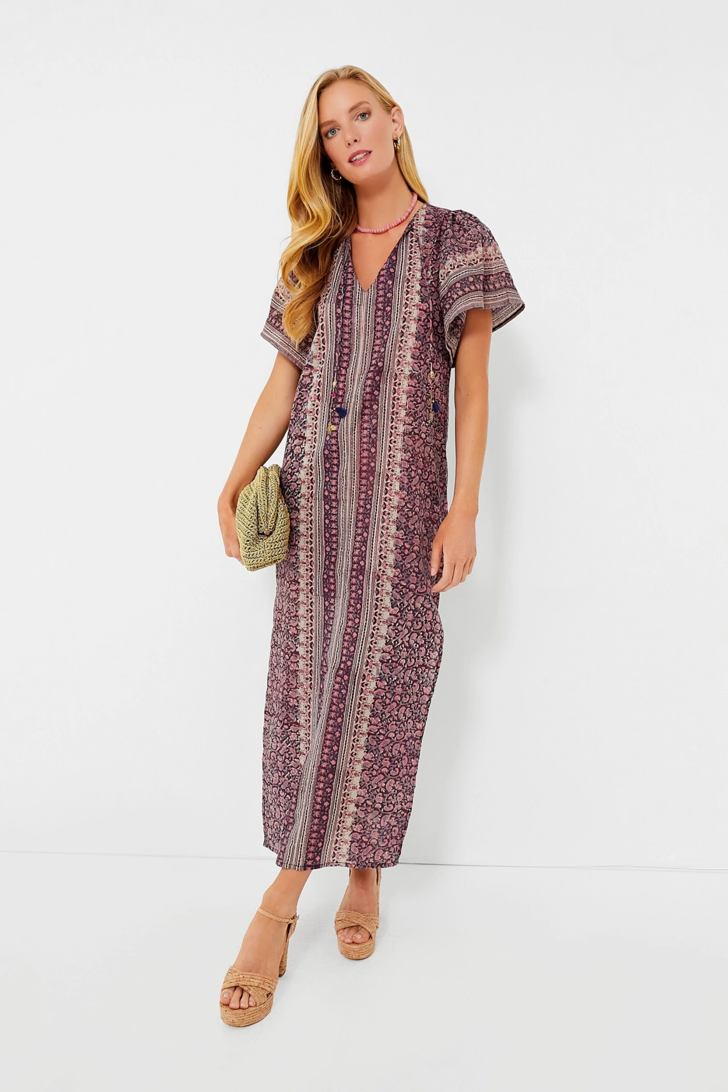 The dreamy Brown Pink Metallic Angel Kaftan is a perfect addition to your vacation wardrobe. The intricate fabric is complimented with eye-catching details such as flutter sleeves and beaded tassels. The relaxed kaftan silhouette and maxi length allows this to be worn all day long, from lounging by the water to grabbing dinner and drinks. Pair with wedges, gold earrings, and a clutch for an effortlessly elegant look.