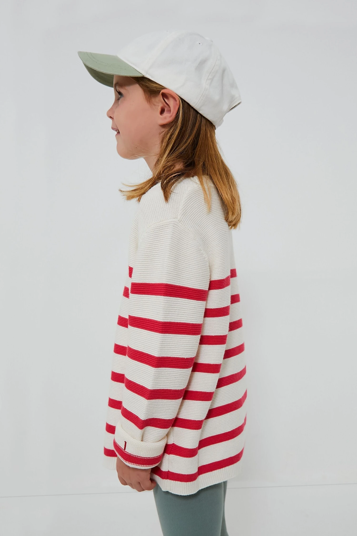 The Cream and Raspberry Garter Stitch Sweater is super cozy and is perfect for keeping your little one warm during outdoor adventures this season. Made from a premium blend in a cozy, textured weave, this roomy silhouette is a closet staple making it ideal for special occasions or everyday wear.Â