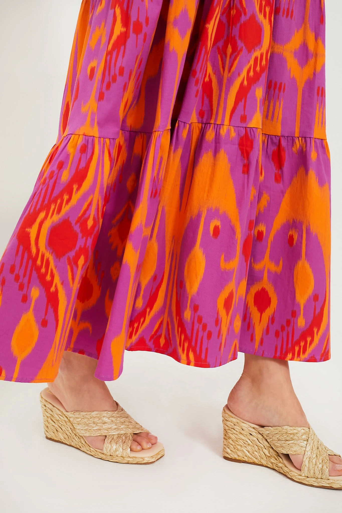 The dress of your dreams, the Exclusive Sunset Ikat Kelly Dress is the encapsulation of easy elegance – and always ensures you will be on the best-dressed list. Versatile enough to wear to a luncheon or wedding alike, the smocked bodice, tie shoulder straps, and flattering fit make this maxi dress one of our must haves. Pair with esapdrilles and statement earrings for a show-stopping look.Â