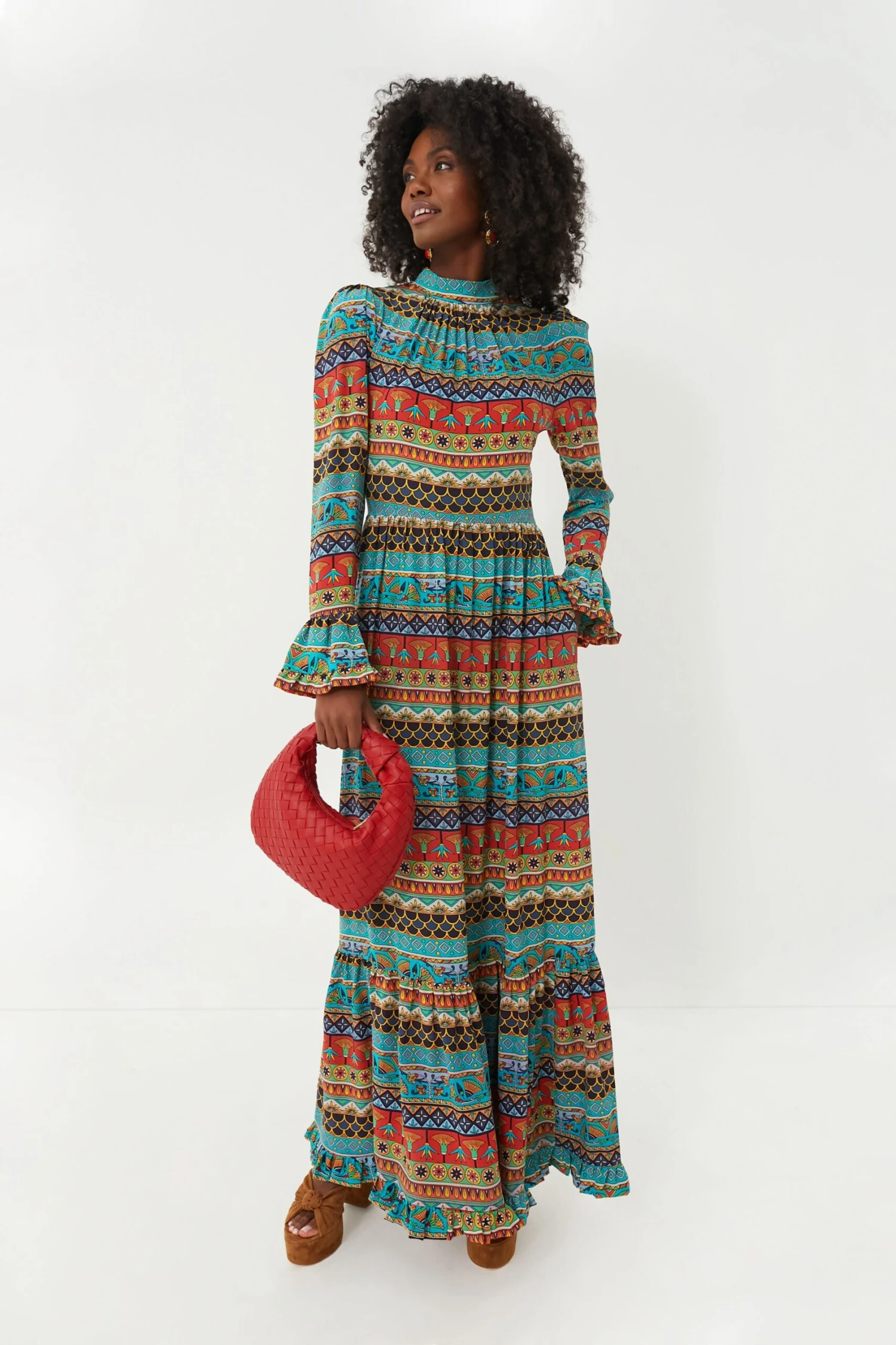 With a silhouette inspired by Italy’s chicest family and a rich pattern reminiscent of Ancient Egypt, the Giza Visconti Dress is fabulously cool and fiercely feminine. Crafted in an ultra-luxe silk crepe de chine fabric that flutters and flows, this beauty will have you looking and feeling like a million bucks. Featuring a mock neckline, puffed shoulders, and ruffles details at the cuffs and hem, this maxi delivers all the frills and drama we love! Style with heels and a handbag for an ensemble that speaks for itself.Â