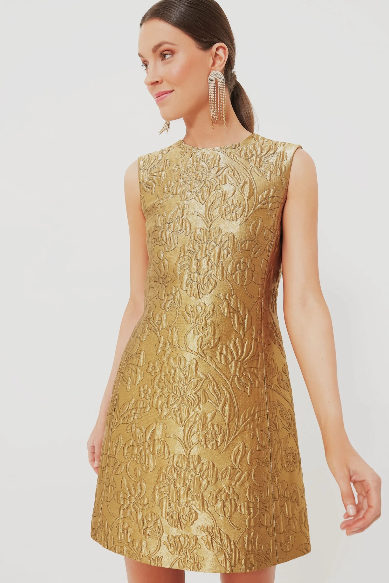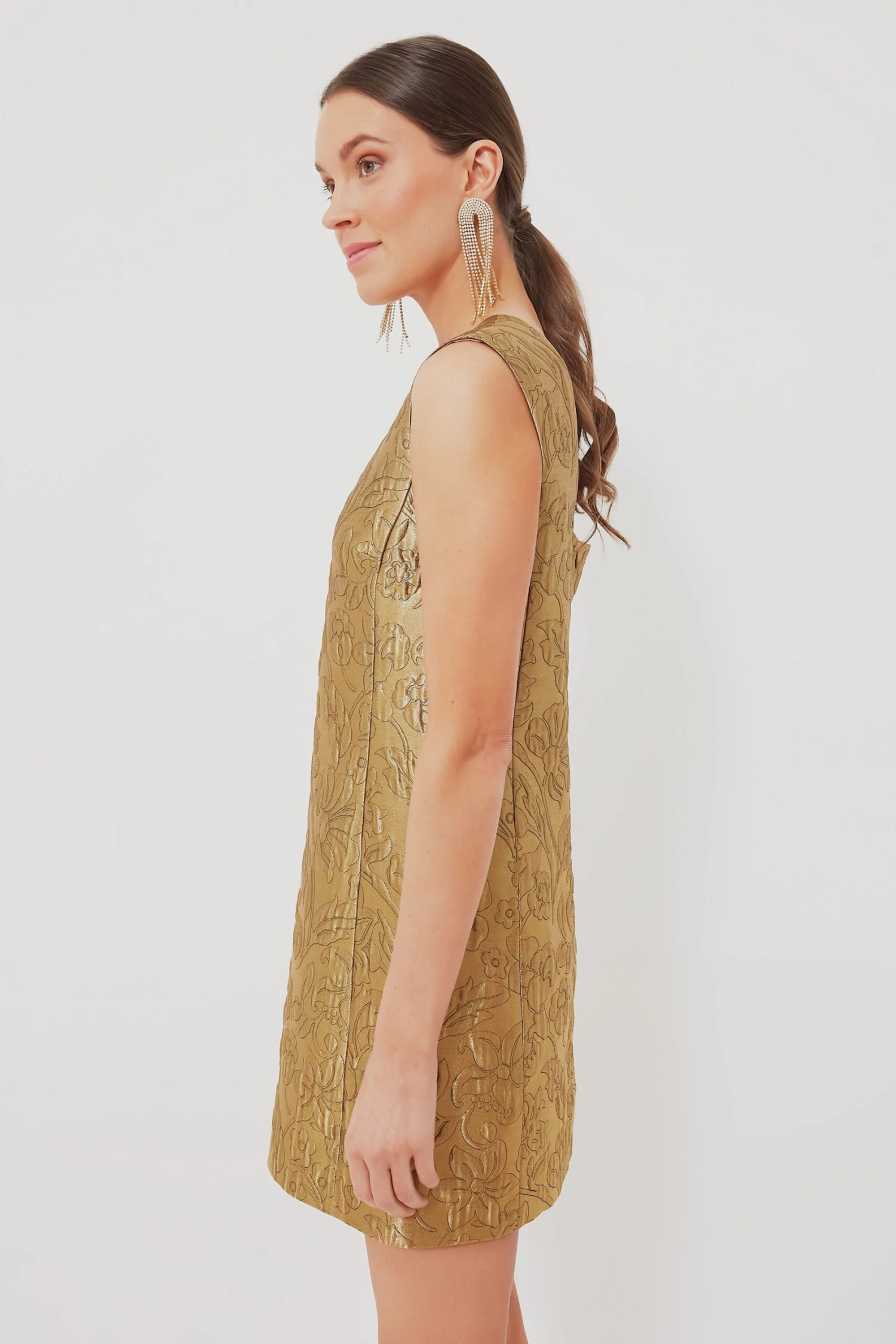 Shimmer and shine this season with the Lurex Irma Dress. Cut from an opulent gold floral embossed jacquard, this classic shift dress features a boxy silhouette that nips in slightly at the waist and a square shaped back framed with thick shoulder straps making it perfect for all special occasions such as cocktail parties, galas, or upscale dinners. Steal the spotlight by pairing this mini with strappy heels, statement earrings and a clutch.