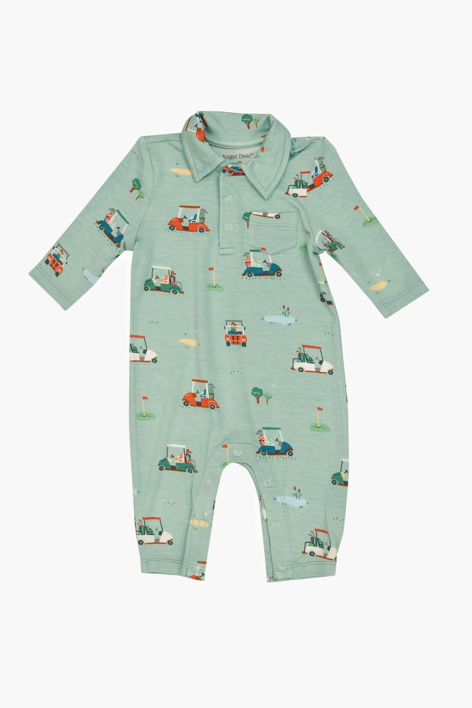 The Golf Carts Polo Romper is an adorable outfit for the future golfer in your life. The spread collar, front chest pocket, and snap button closure add adorable details, while the inner leg snaps allows for easy diaper changes.Â