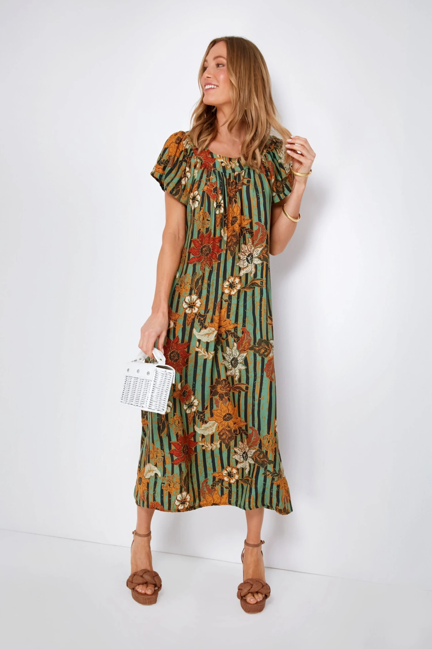 In earth-toned hues perfect for days spent in the sun, the Green Stripe Moss Sienna Dress is simple in its construction to complement that incredible sunflower print. An easy-breezy, relaxed fit ensures you stay comfortable from day to night, while the silk composition adds an element of luxury that will have you feeling your very best. Finished with an elegant round neckline and flutter sleeves, this is a must-have style. Pair with heels and a clutch for elevated occasions, or go a bit more casual with sandals and gold jewelry.
