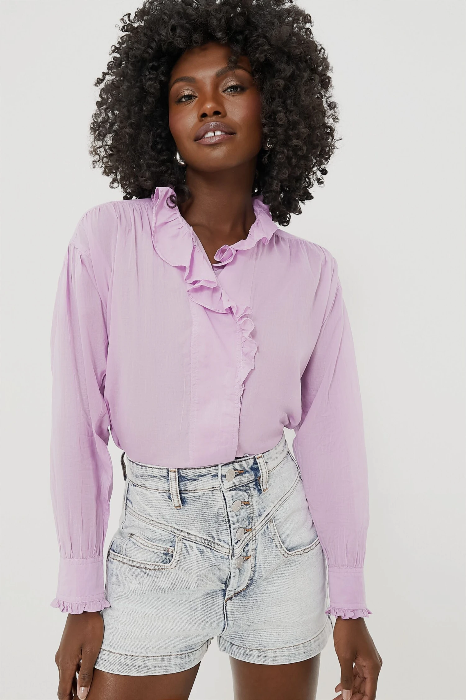 - Ruffle trim at cuffs