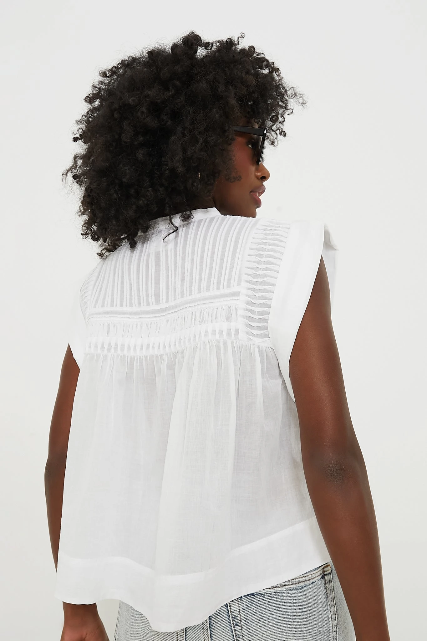 Understated yet unique, this feather-light White Laeza Blouse is cut for a swingy and boxy fit. This semi-sheer style features a stand collar, short sleeves and an elaborate arrangement of pintucks at the yoke. Pair this neutral number with a flowy maxi skirt and espadrilles for a boho-chic look, or with denim and statement jewelry for an outfit that is perfect for dining al fresco.