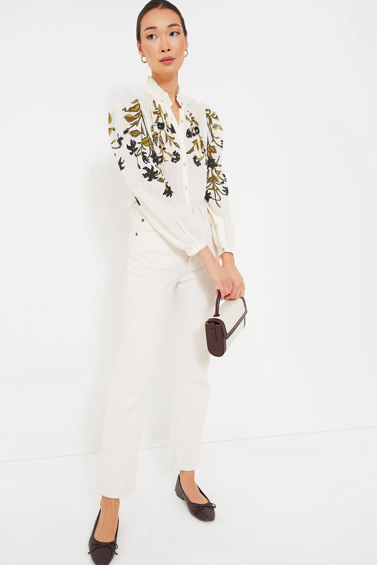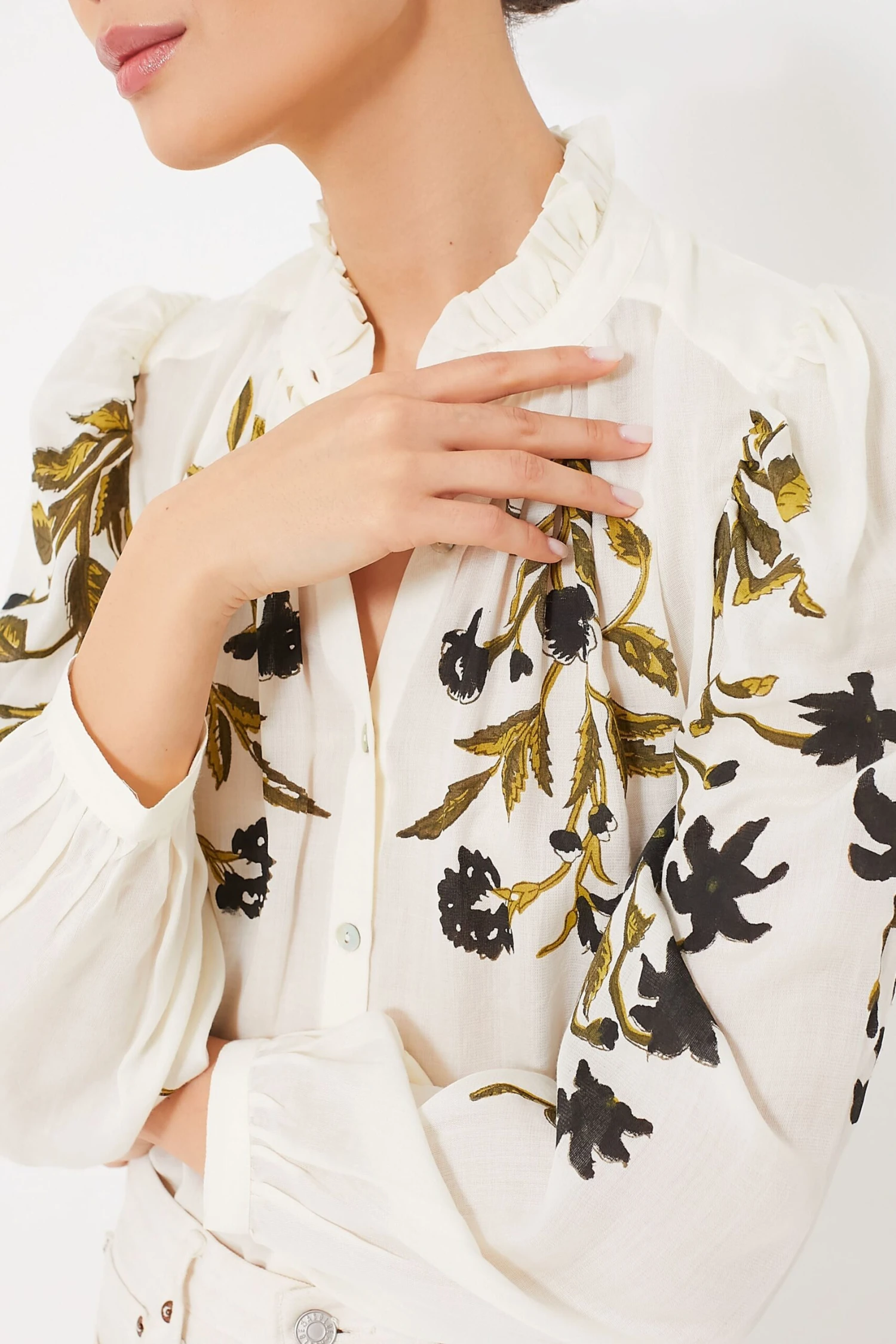 Blooming with earthy hues and hand-block printed flowers, the charming Ivory Lily Annabel Olive Valley Shirt is a staple in any season. This slightly cropped silhouette features a ruffled stand collar, subtle puff shoulders, and a floaty fit that all come together to create an understated but elegant top. Made of lightweight and breathable tencel, this style is beautifully paired with neutral pants for a on-trend monochromatic look or tried-and-true denim for a boho-chic vibe.