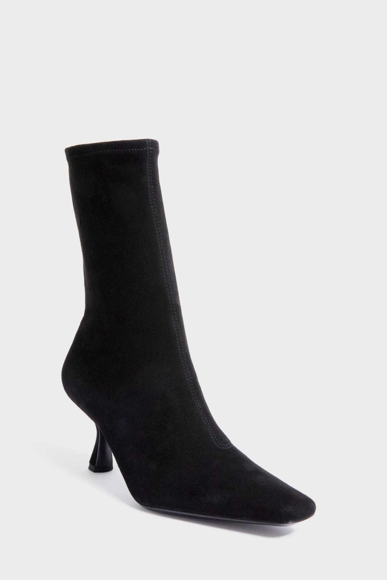 The Black Stretch Suede Tatum Boots are your perfect elevated shoes for year-round wear. The pointed toe and curved heel create a modern silhouette, and the slim fit and ankle length allow these to be worn under pants or with dresses. We are styling these with wide-leg trousers and a white button down or with boot-cut pants and a slim turtleneck.Â