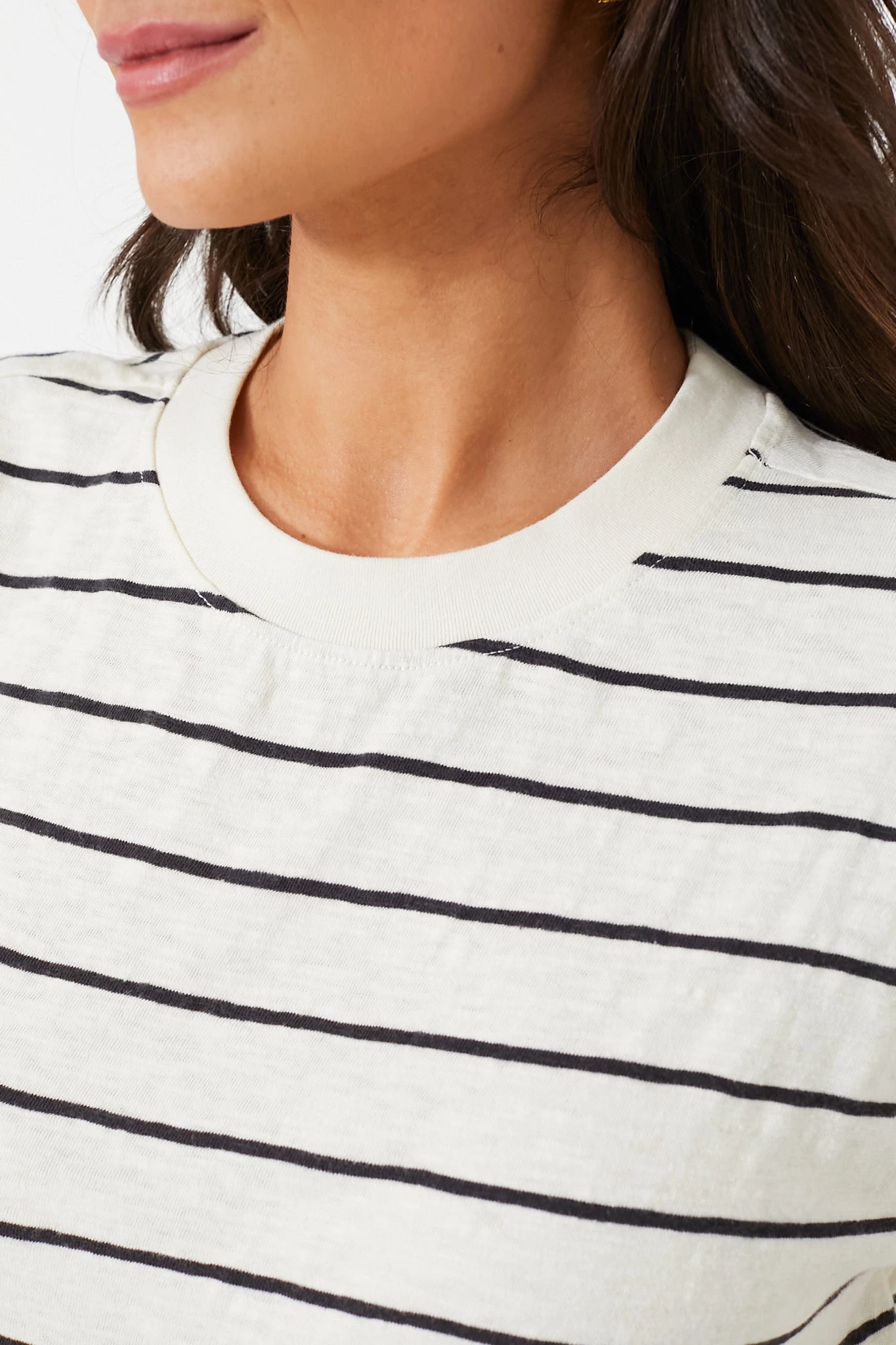 Washed to old-favorite perfection, the White and Black Stripe Heavy Slub Boxy Crew Crop is going to be your new favorite go-to tee. Perfect for transitioning seasons, it is made from heavyweight material and has been garment-dyed for a broken-in, sun-faded look. Classically chic, it pairs perfectly with pants, shorts, skirts, you name it.Â