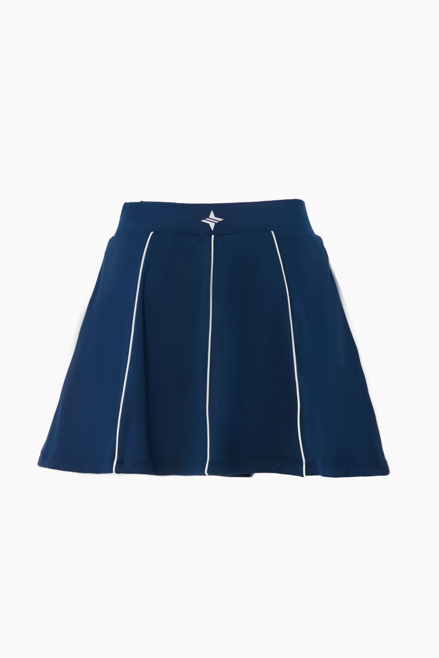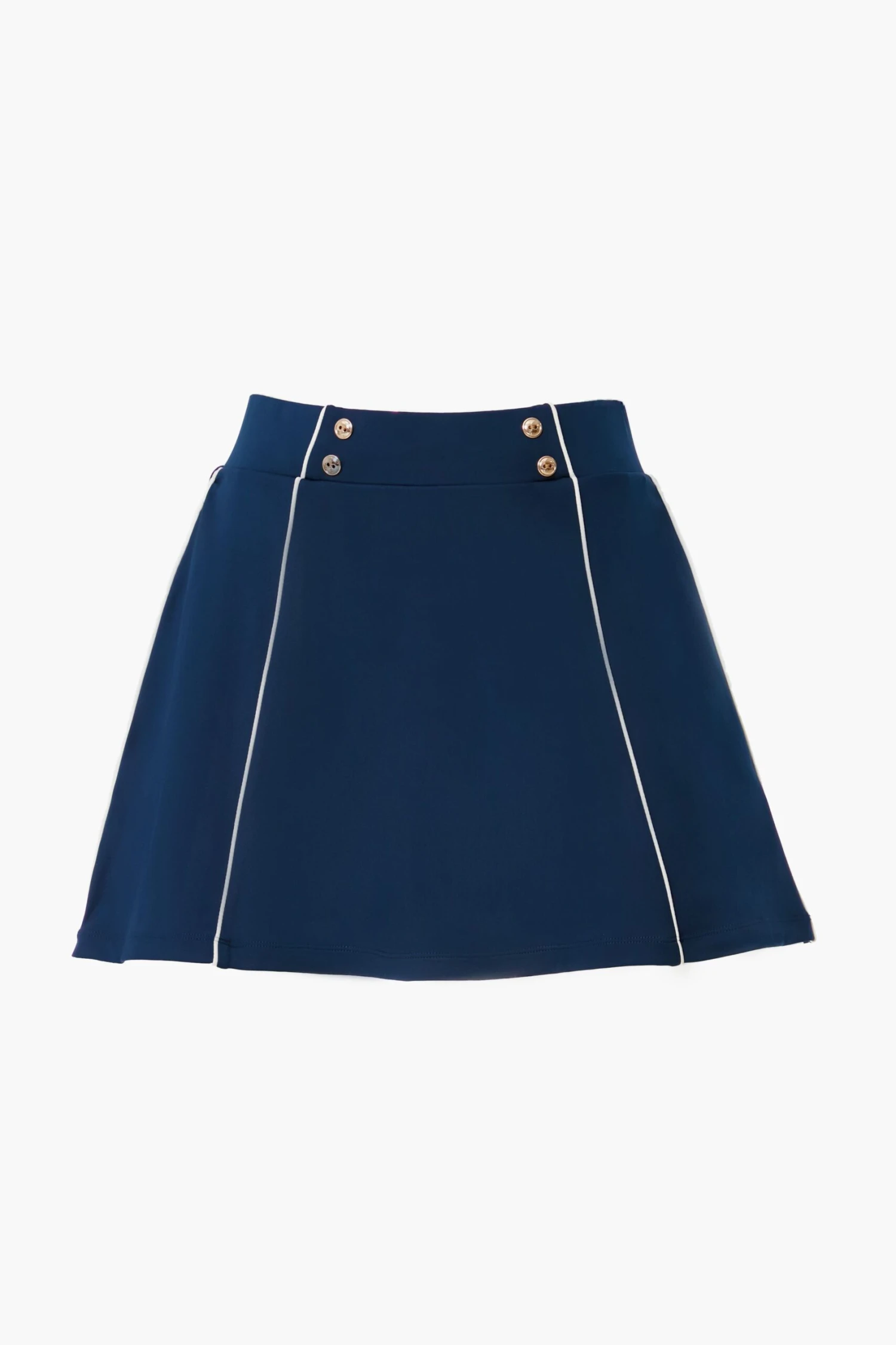 Look the part on and off the course with this retro inspired skirt. Slimming seams create a flirty fit on this A-line mini that plays well with a fresh polo tucked in to show off the imitation mother of pearl accents on the waistband. Detailed with wildflower-printed compression shorts, a ball pocket, and tee holders, the Navy Piped 15 Inch Renee Golf Skirt has all the frills and none of the fuss.