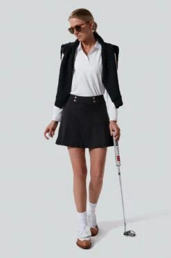 Introducing our longest athletic skirt, meet the Navy Plaid 17 Inch Helen Golf Skirt. Elegant in print and shape, this new plaid knit jacquard medium length mini will bring a polished and sophisticated look on and off the course. Designed with classic details in mind, a signature d ring is placed below the wide waistband for an easy golf glove carrying option as well as pockets along the front and back for your scorecard and course essentials. Compression shorts are built in underneath and include tee holders and ball pockets as well as gripper tape along the leg opening for extra confidence when retrieving your hole in one from the ball cup!Â