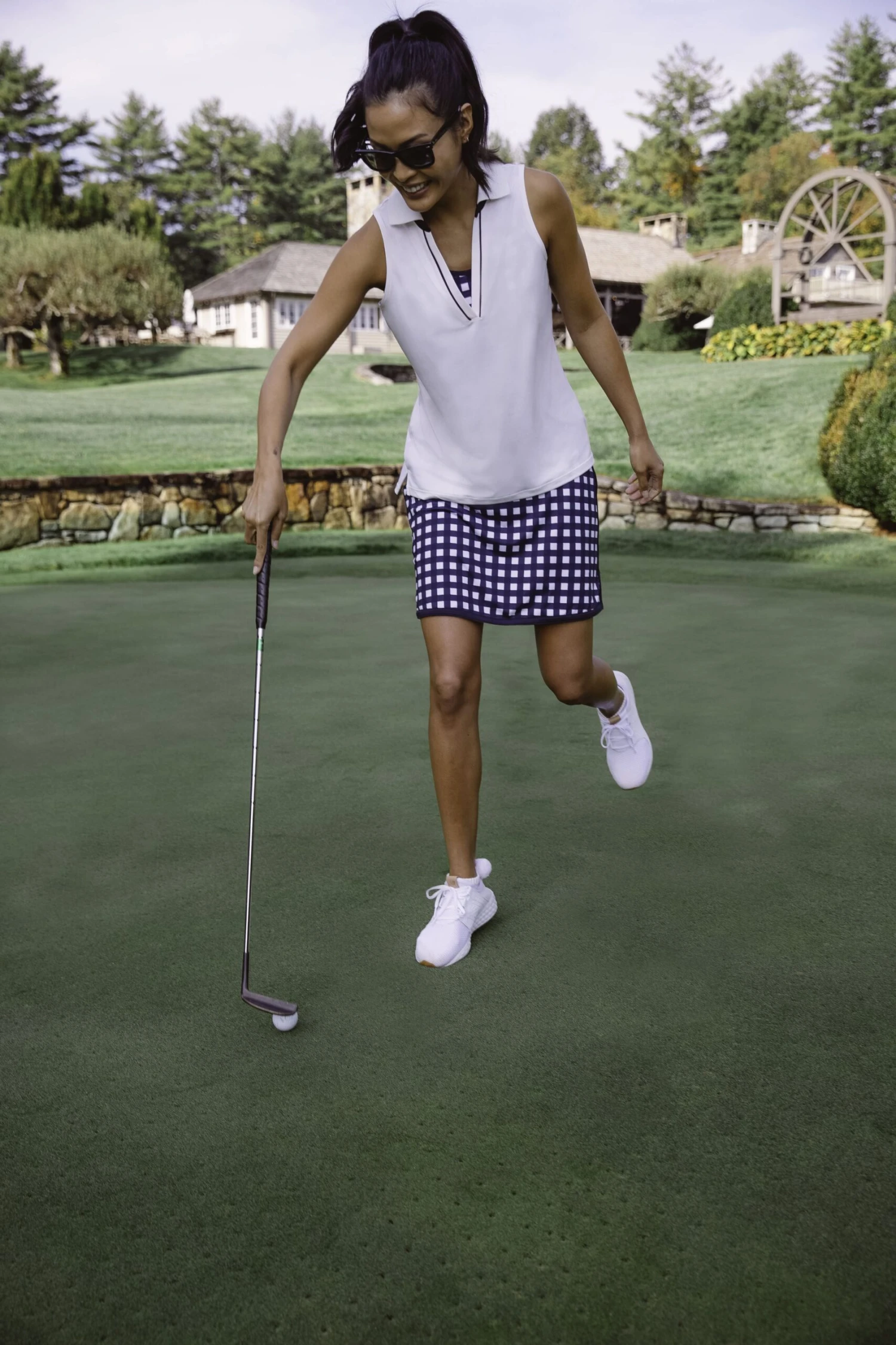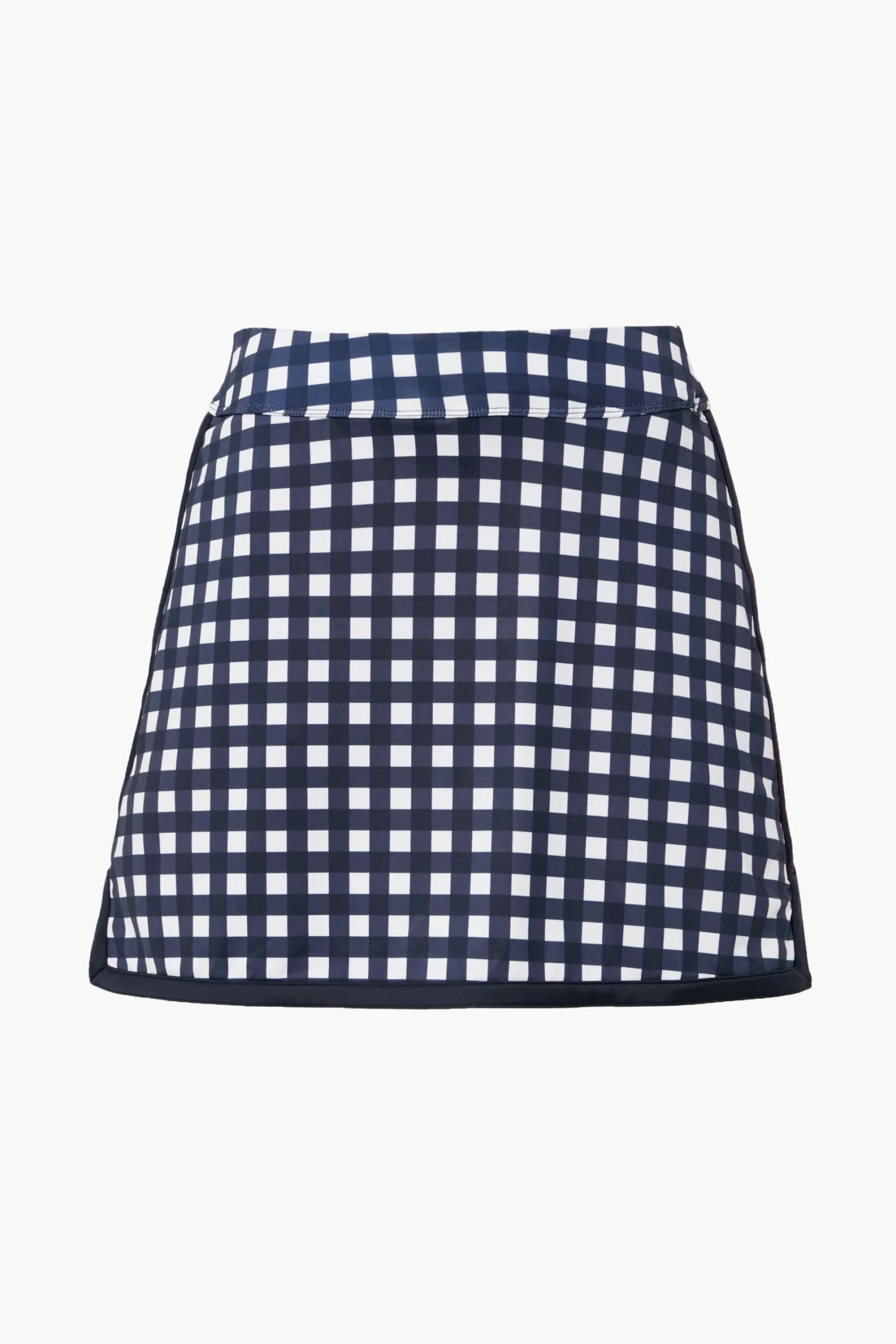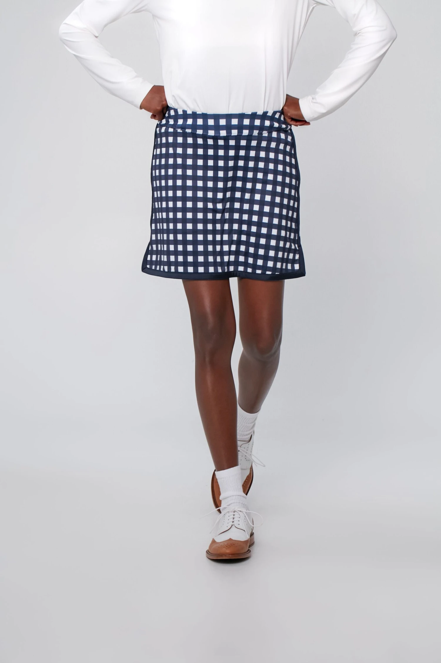 From the greens to the clubhouse, the Navy Trellis Gingham 16 Inch Karrie Golf Skirt checks all the tee boxes. Designed with movement in mind, this features a high-rise compression under short with silicone grip tape, a ball pocket, tee holders and slight side slits for minimum adjustment and maximum style. Pair with the matching sports bra and polo for a chicly overdressed but under-par look.