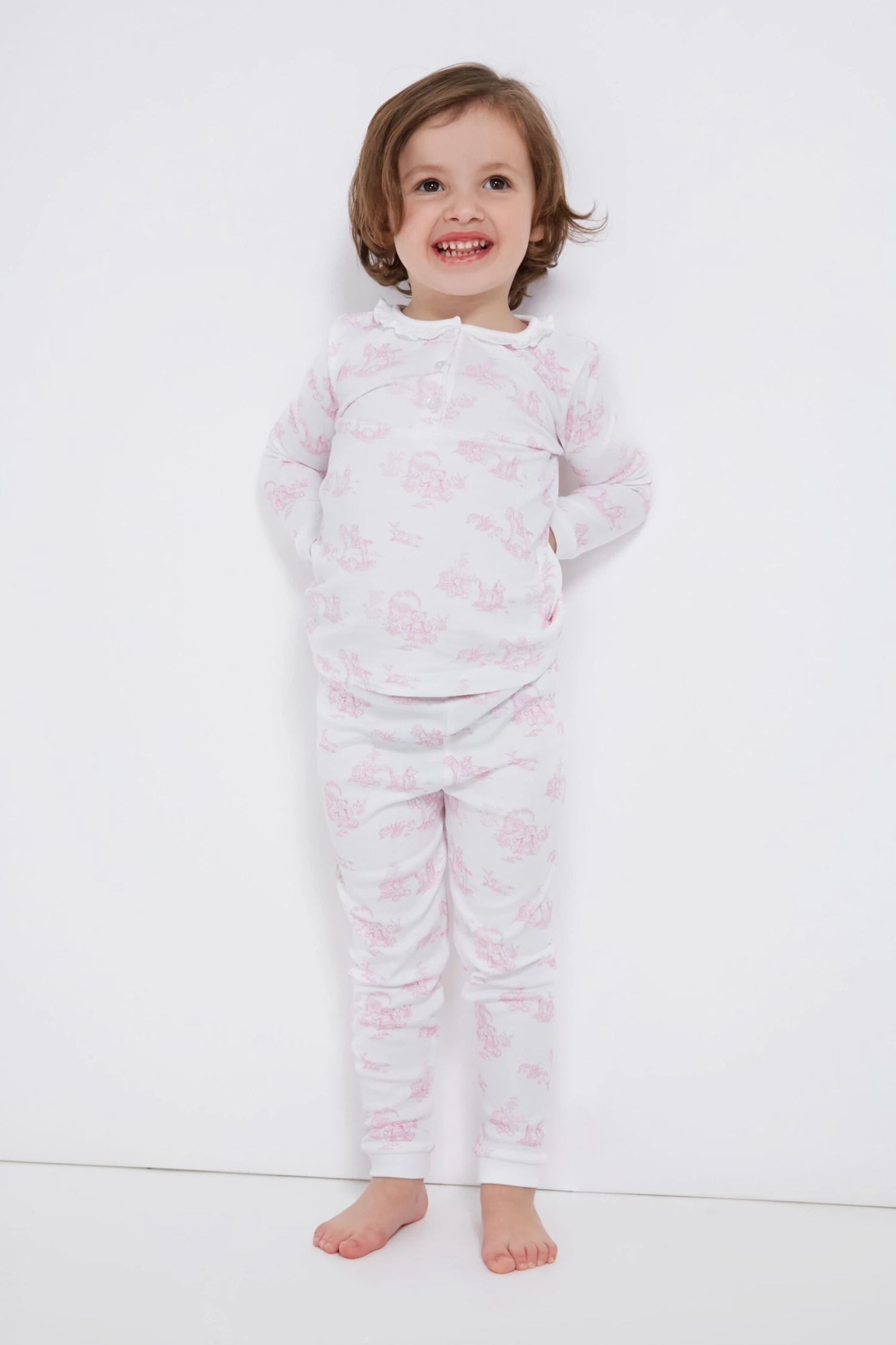 The Pink Toile Baby Pajamas are made from the softest Pima cotton with a bear-printed fabric. The true secret behind the softness and quality of these products comes from the northern coastal valleys of Peru. The properties of this fiber create for a more durable fabric, that gives it its unparalleled luxurious touch that is most desired. Your little one is sure to have sweet dreams in these cozy PJs!
