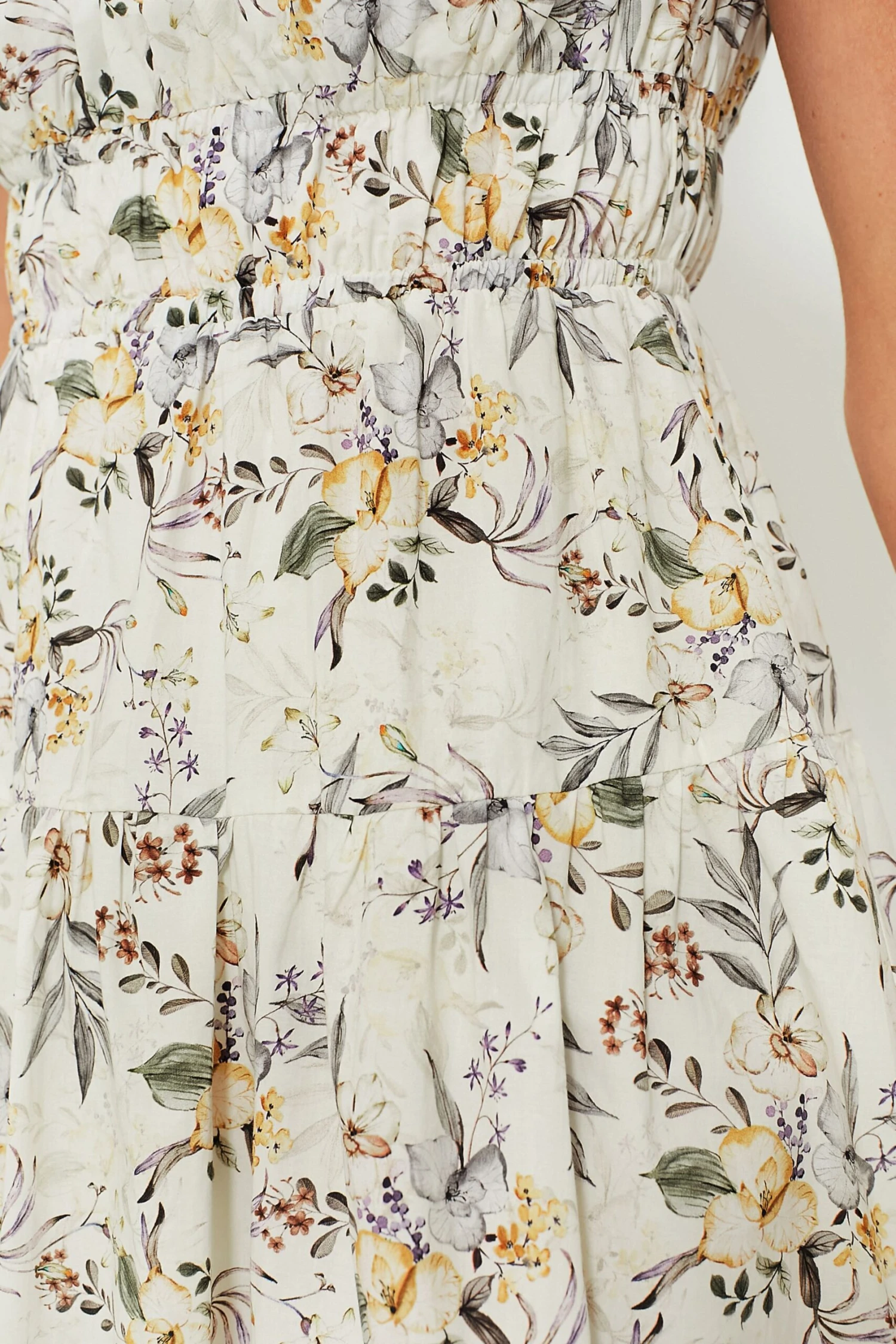 The Sage Multi Mindy Dress instantly transports us to a warm day in a romantic garden. This midi includes short ruffle sleeves, a smocked bodice, and a tiered skirt, creating a feminine silhouette that lays the canvas for an exquisite floral pattern. Pair with platform sandals and simple jewelry for a brunch or luncheon, or with heels and pearls for a more formal look.