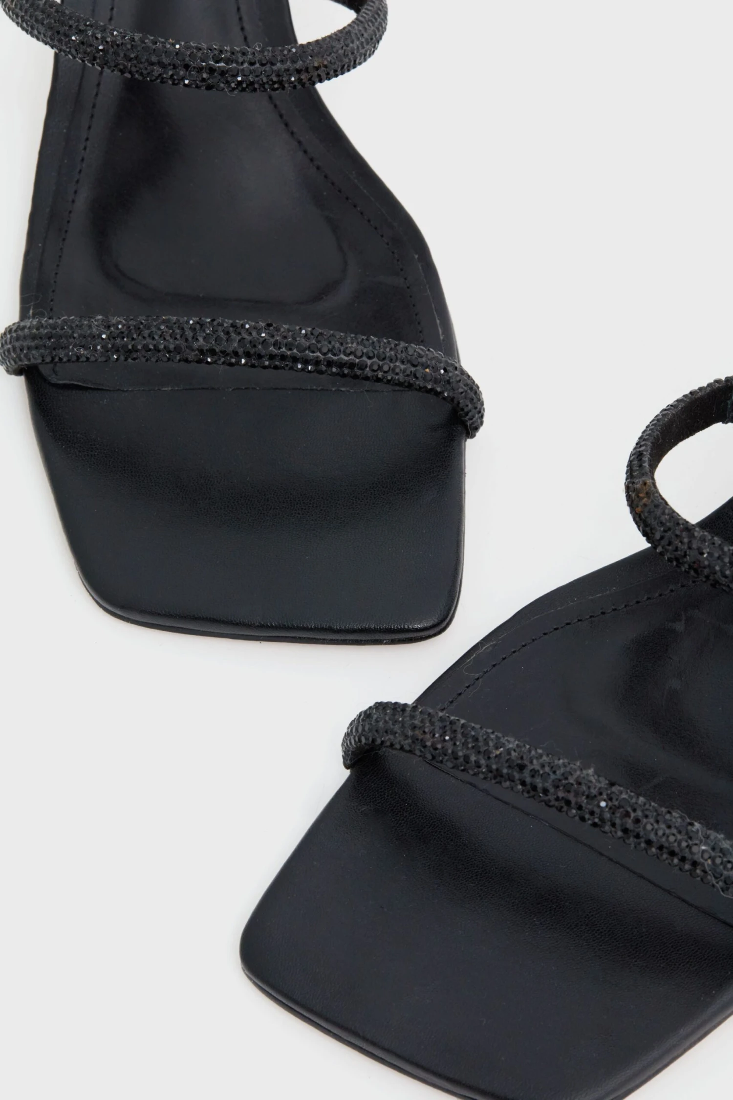 Modern meets minimal in the Jet Square Taliah Heels, a mule silhouette in leather with slim straps, a square toe, and a stiletto heel. The studded embellishments add a subtle, luxe touch, and the simple black makes these elegant and easy-to-style. Pair with leather pants and a button down for a chic daytime look, or with an LBD and clutch for an elevated date-night look.Â