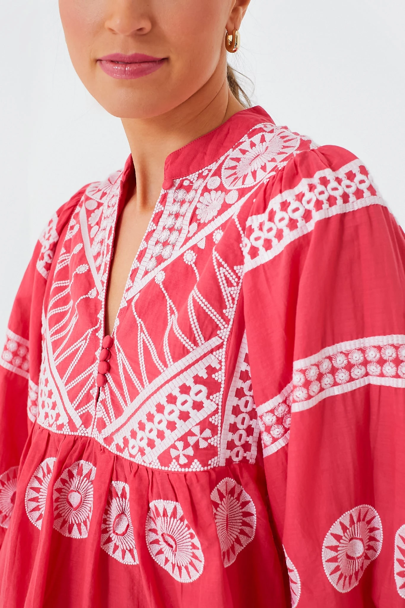 Add some spice to your closet with the Soleil Red Mandarin Balloon Sleeve Top. With a chic, bohemian sensibility, this top is full of charming details such as a mandarin collar and notched neckline with covered buttons. A swingy, airy shape perfect for warm weather destinations, we love to pair this style with white denim and strappy sandals to sip cocktails at sunset.