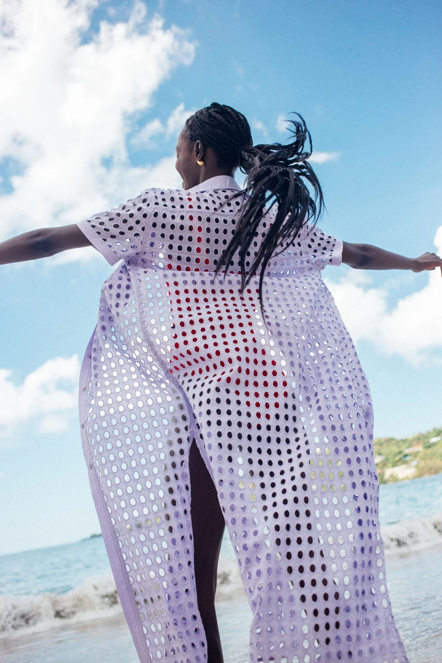 Fresh and oh-so-fun, we are loving the easy-breezy Wisteria Oxford Tunic. Cut to a maxi length with side slits at the hem to create ease of movement, this cotton coverup features a collared neckline, button down front placket, and all-over eyelet detailing that is left unlined to show off some sunkissed skin. Throw it on over a swimsuit and add some colorful beaded jewelry for an on-trend look to grab a daiquiri from the beach bar, or try it with a slip underneath and add sandals for a casual styling perfect for vacation!