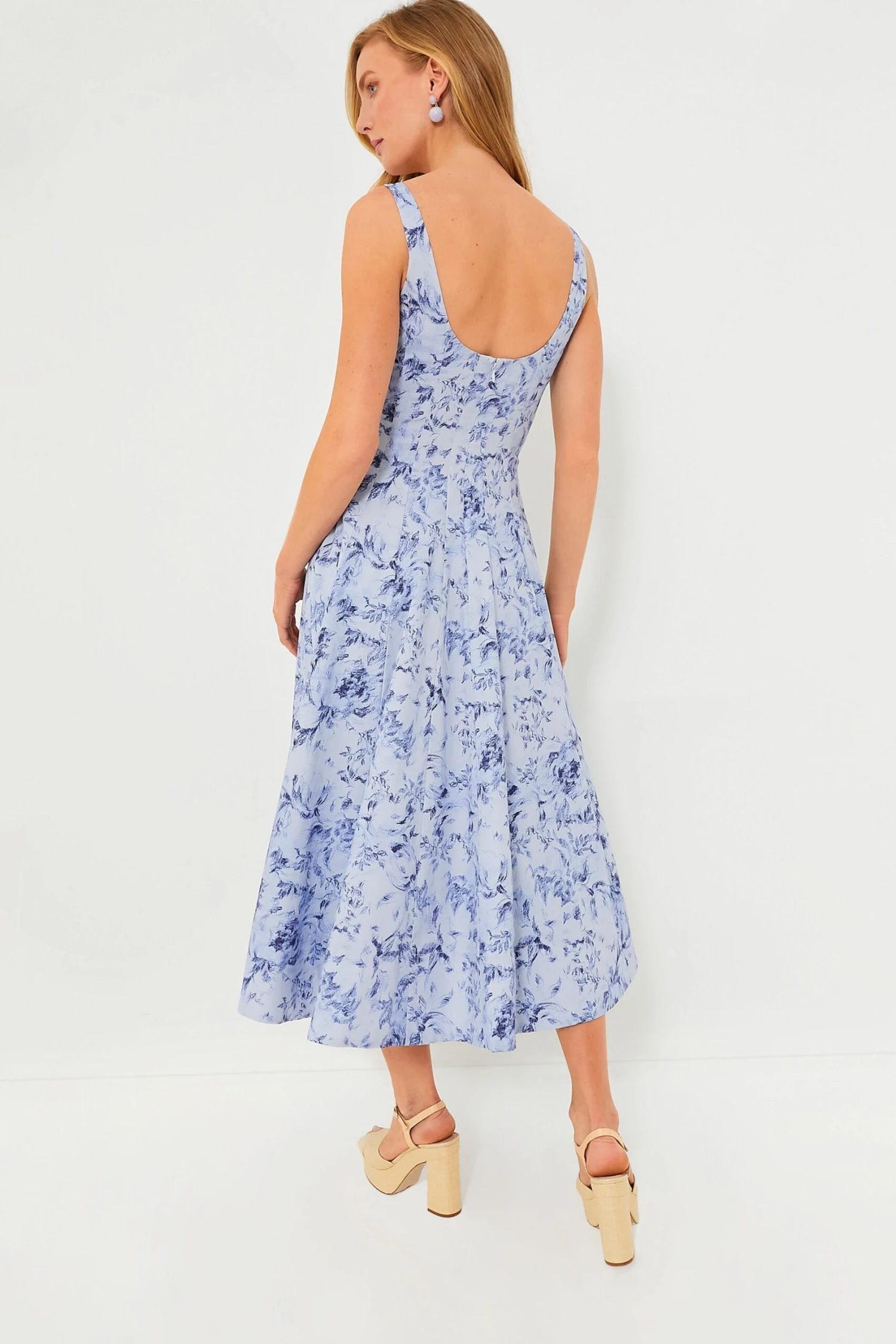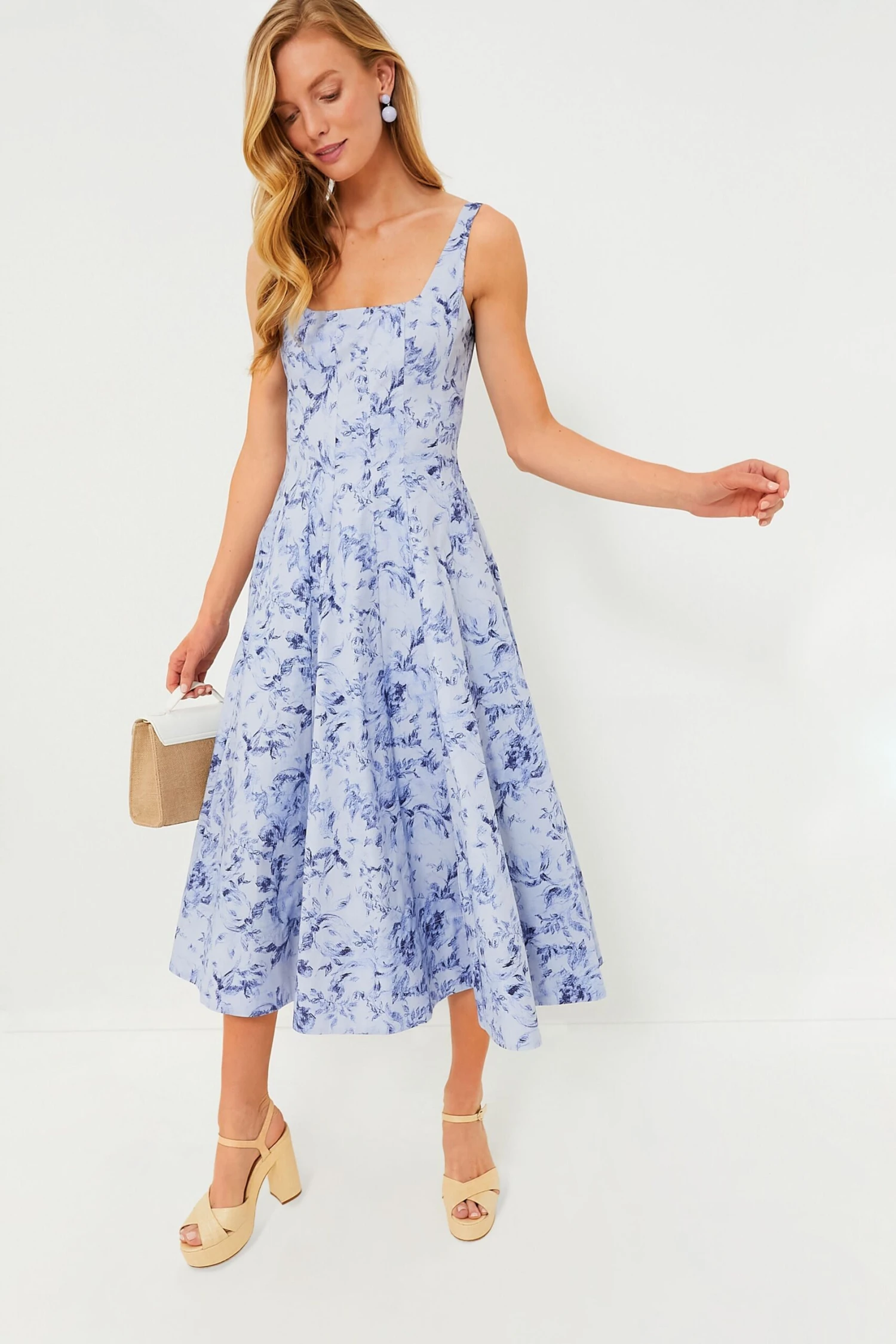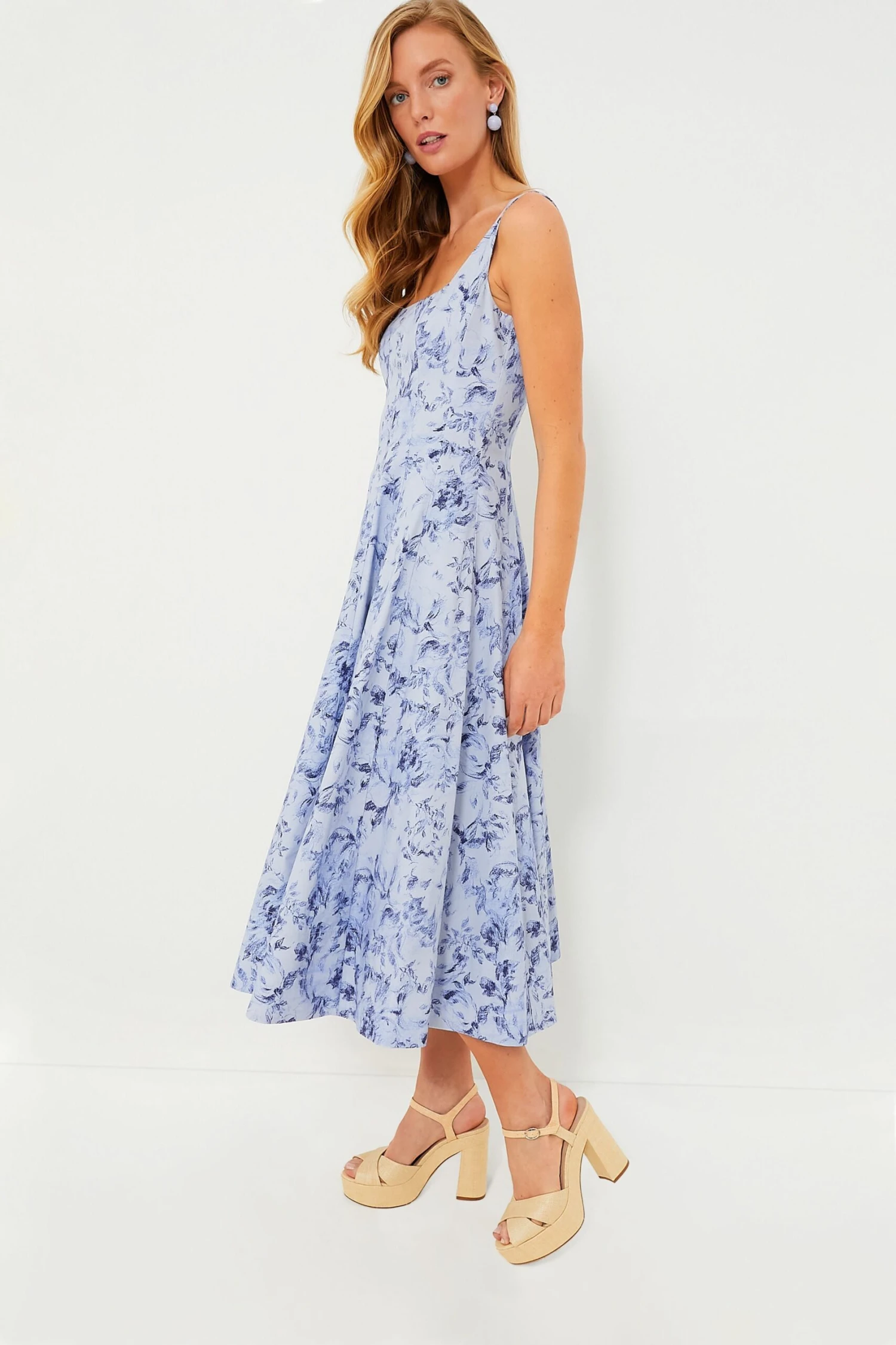 The Periwinkle Sketchbook Floral Wells Dress is elegant and sophisticated. A corset-style panel bodice creates a flattering, fitted shape through the waist and a full skirt for a dramatic effect. Made from lightweight cotton, this midi is ready to be shown off, pack it with you on your next vacation and pair it with raffia accessories for a glam resort look.