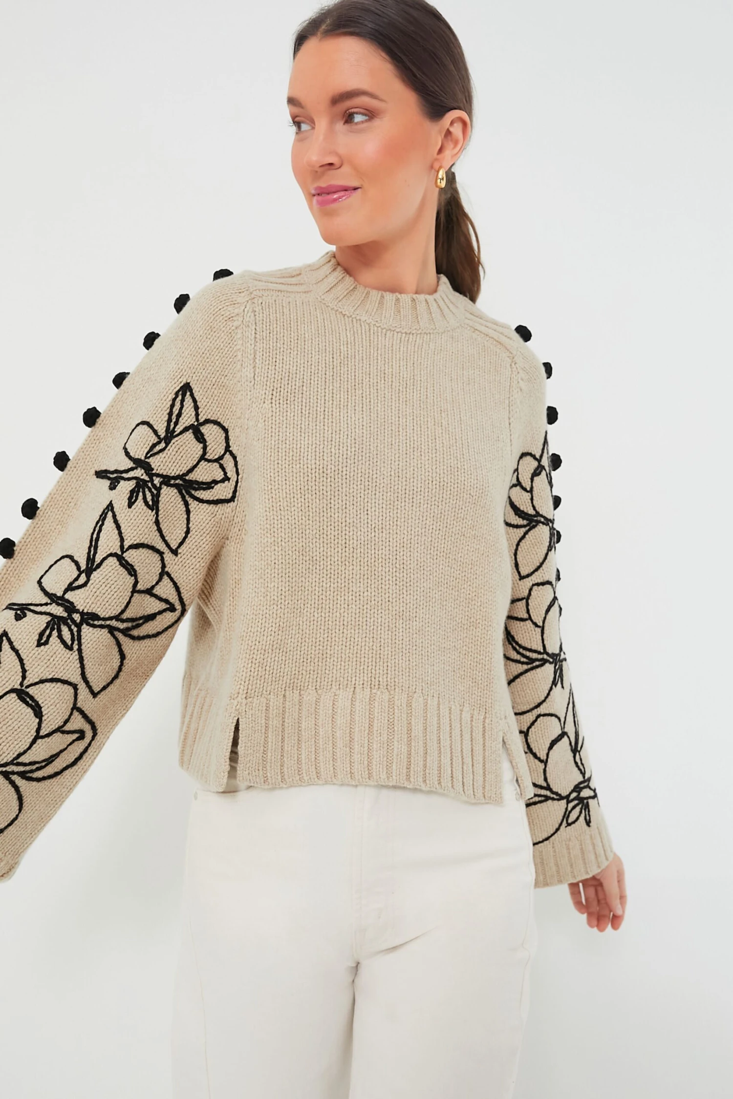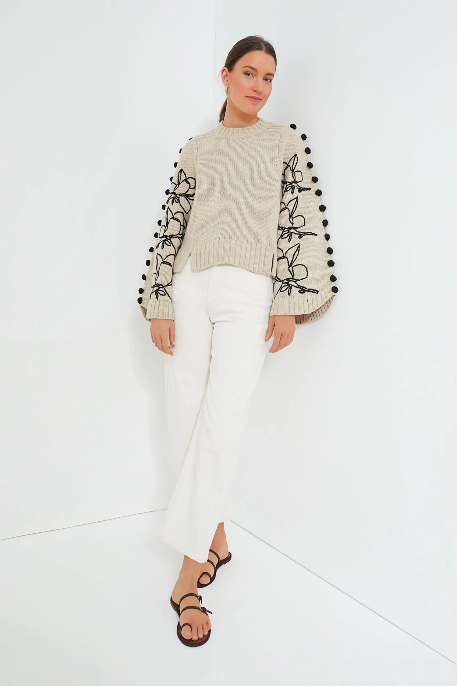 The Stone Black Adele Wool Embroidered Knit has a tasteful and striking silhouette with beautiful embroidered chic kimono-style sleeves with hand-knitted pom poms. Crafted from certified Responsible Wool Standard yarn, this cozy mid-to-heavy weight sweater has a dual-notched hem, adding a touch of flair. A great go-to style for cold-weather parties, we are pairing this with the tonal denim and black accessories for a casual but chic look.