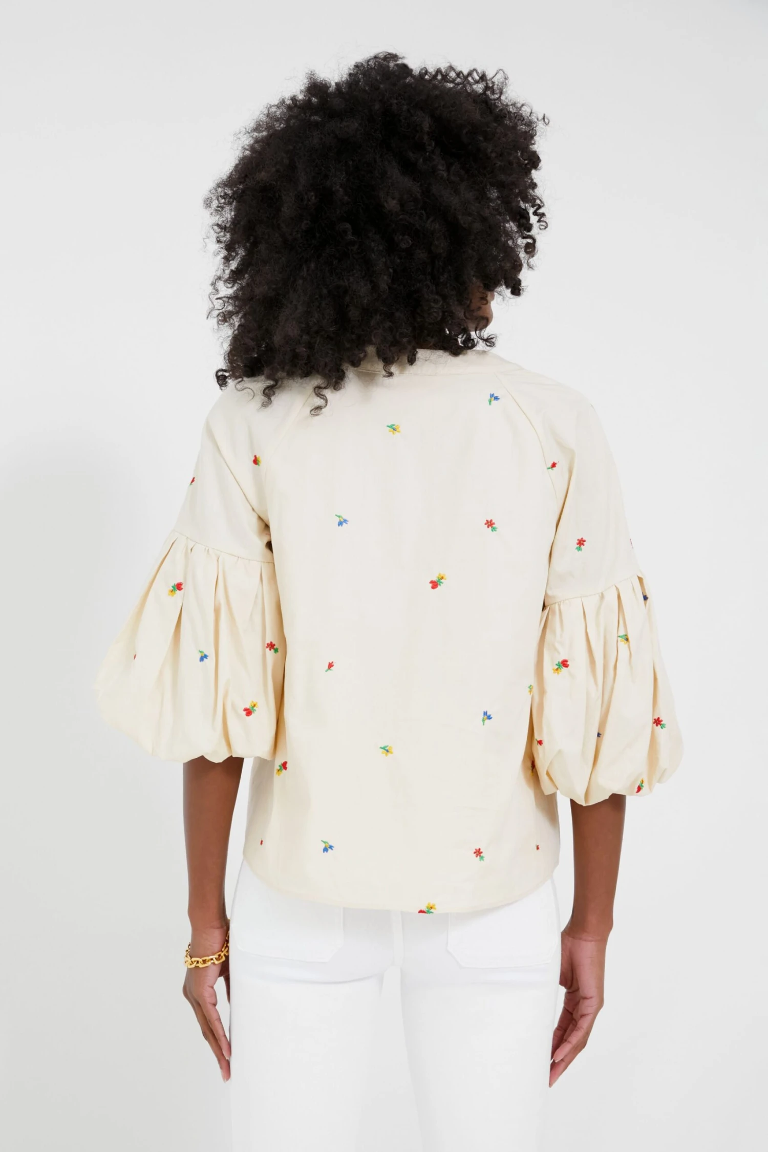 Featuring unique puff bell sleeves and delicate floral embroidery, the Blooms Blouse will be a perfect addition to your wardrobe this season. We’re wearing this crisp cotton top with white denim and a colorful bag for an elevated daytime ensemble. Or pair with cutoffs and flat sandals for a chic yet casual daytime look. Either way, the ways to style this embroidered beauty are endless!Â