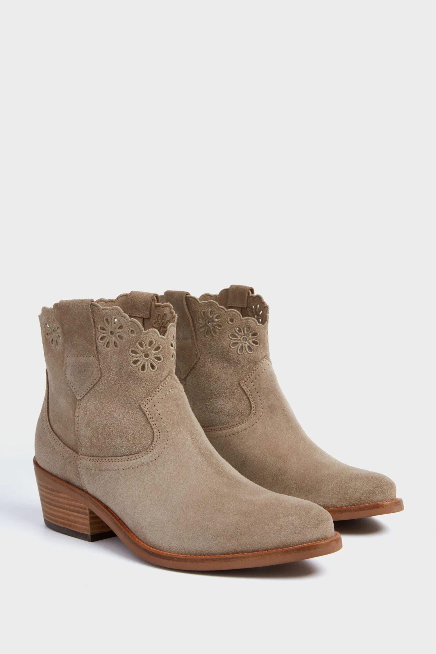 Step into the cowboy trend with this stylish take on authentic western style. The Taupe Cali Broderie Suede Cowboy Boots are made from the softest oiled suede upper, cropped to the ankle with a moderate Cuban heel, making them easy to wear all day long. The adorable addition of a feminine cutout detail makes them perfect for styling with jeans and a chunky knit for daytime or with a dress for a more formal evening look.
