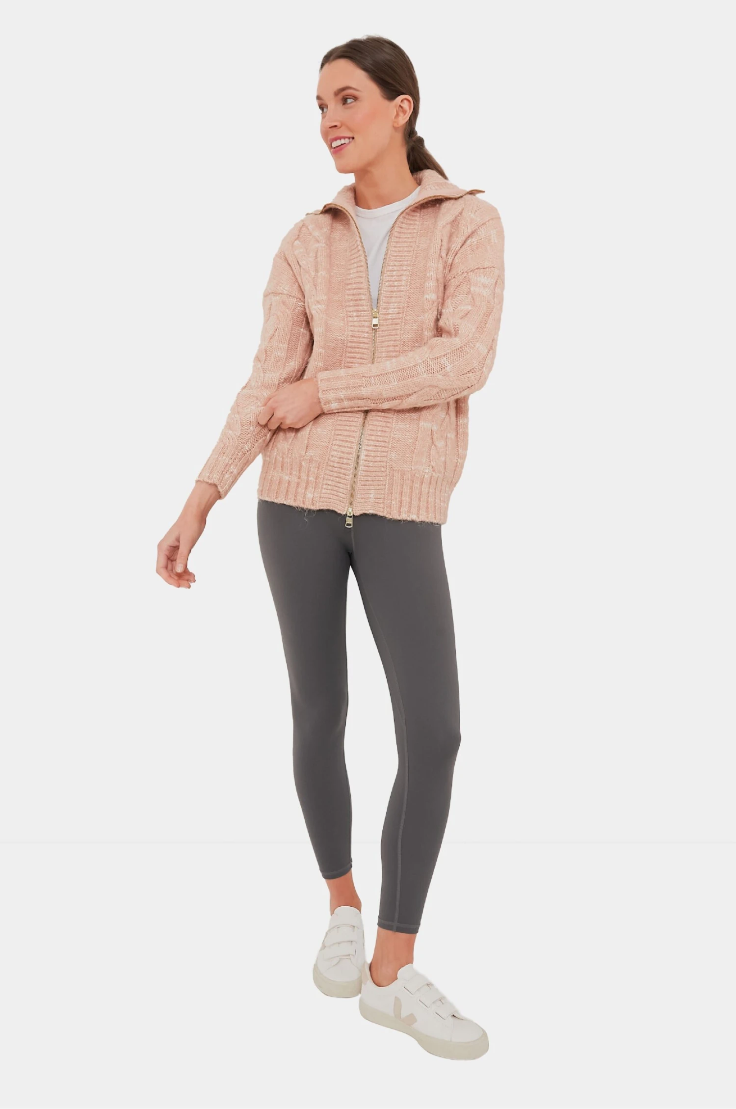 The Blush Tan and Egret Aida Jumbo Cable Knit Jacket is the ultimate winter warmer. Featuring a high neck and two-way zip for versatile styling, this jacket is made in Varley’s soft and warm Dalmatian Knit yarn. The chunky cable knit design and contrasting ribbed trims elevate the piece. Pair with denim and boots or leggings and sneakers!