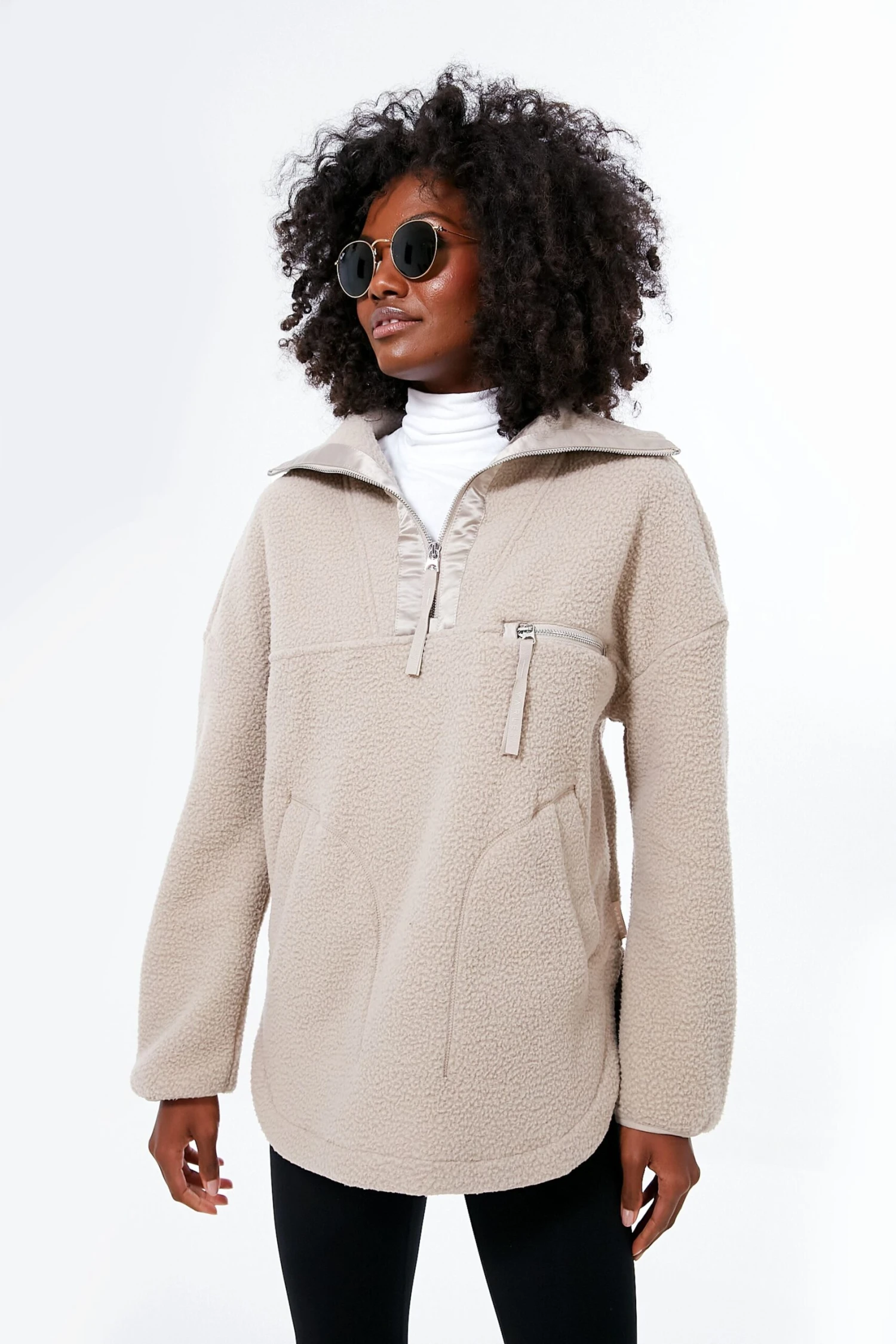 Designed for supremely stylish layering, this versatile knit can be thrown on over everything from active sets to the everyday denim and tee. Crafted in a warm, lightweight and 100% recycled Plush Borg Fleece, this versatile, elegant and sateen-trimmed popover jacket has an oversized, easy fit, a half-zip collar and a curved, mid-length hem.