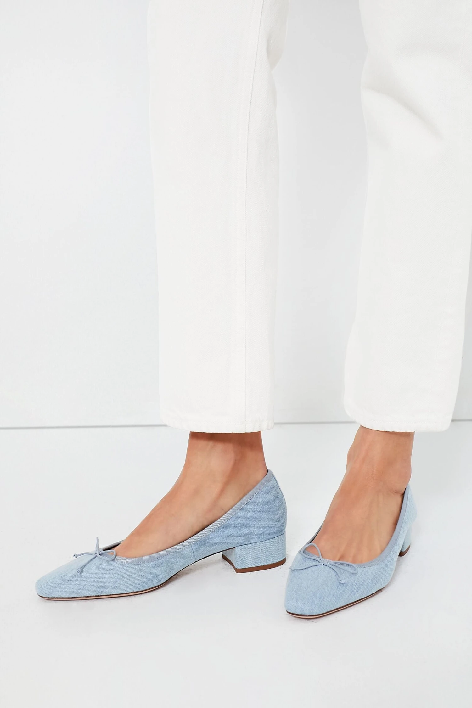 The ballet flat, reimagined. Updated in a light blue fabric inspired by timeless denim, the Cecile features a delicate bow and grosgrain trim, adding special style to a classic pointed toe pump. The low block heel gives you enough height while remaining easy to walk in, making them great for both work and the commute. Pair with trousers and a sleek blouse, or with white denim and a tailored blazer, for an ultra-cool look.