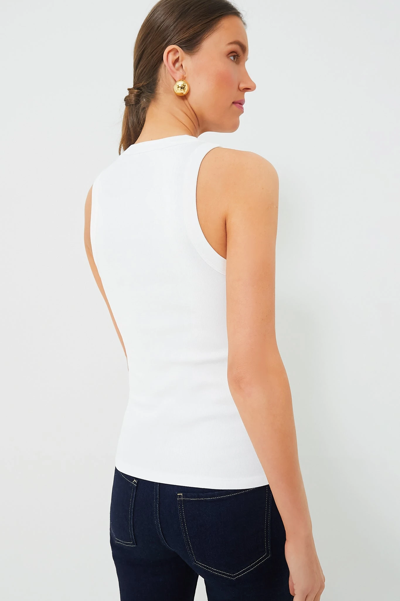 A classic closet staple, the White Jordyn Tank is perfect for wearing on its own or layering under sweaters and blazers. A slim fit and contoured racer-front design defines this style. Pair with denim and sneakers, and throw on a blazer to elevate the look.Â