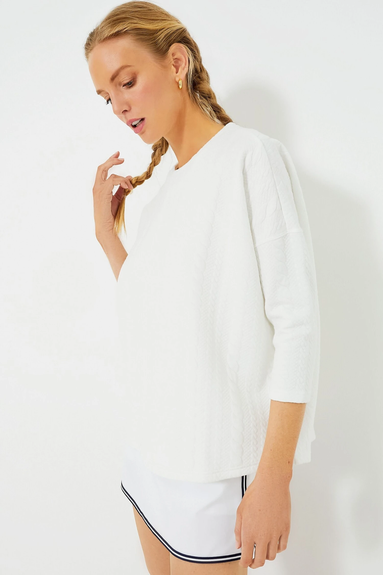 The perfect outfit topper to take you from a warm-up run to a coffee run, the White Cable Ally Swing Sweatshirt was designed with mobility in mind. This soft-to-touch, best-selling style features classic cable quilting, slimming, fitted sleeves, and a swing shape body that pairs perfectly with leggings, shorts, and performance skirts for an all-activities piece.