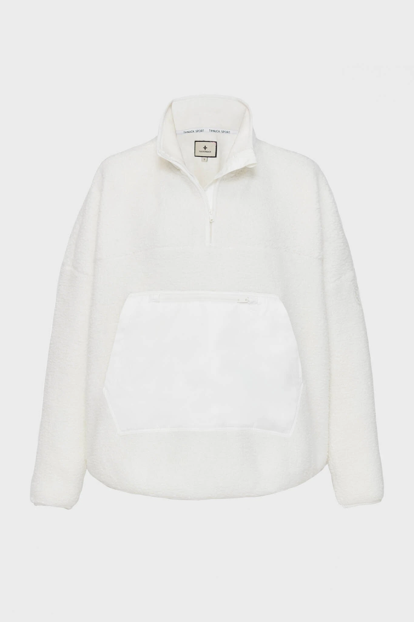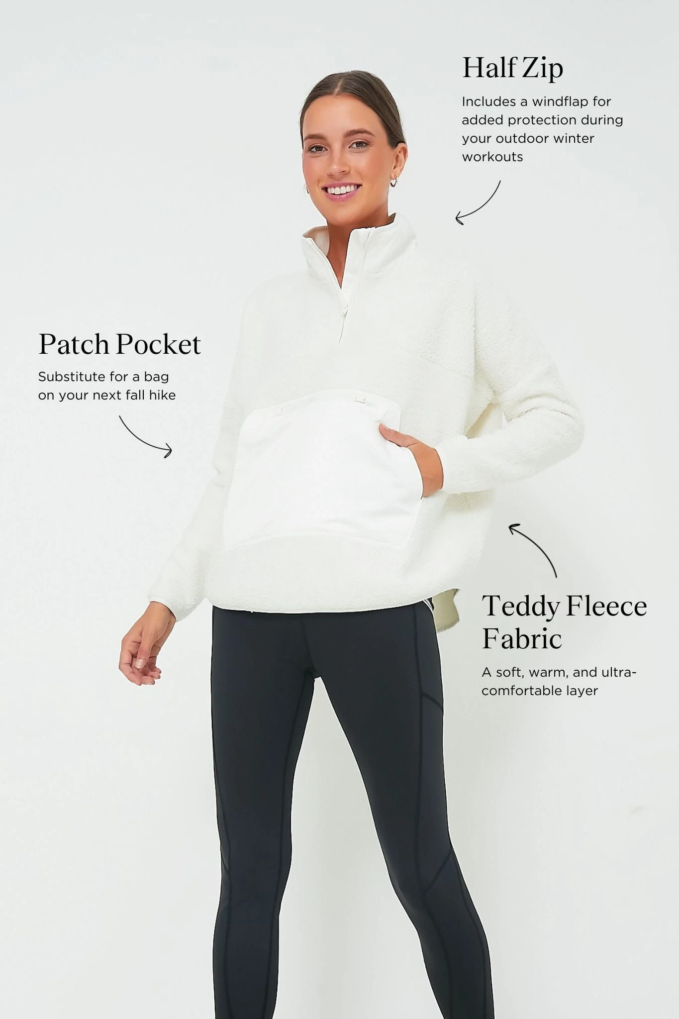 Super soft teddy fleece fabric meets functional style for the ultimate throw on and go number. The White Fleece Cady Quarter Zip is designed with a half zip and wind flap for added protection against cold weather and an additional patch pocket on top of a kangaroo pocket that makes for easy hands free hiking and adventures.Â