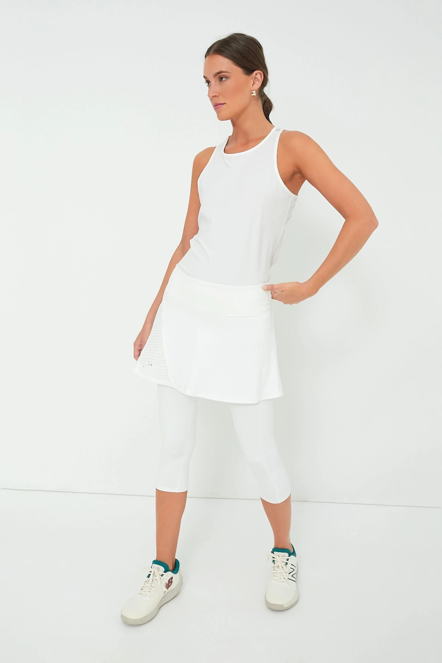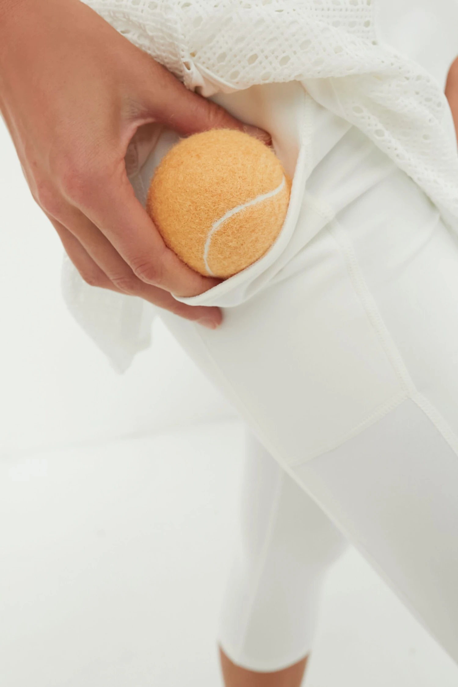 Perfect for power walking but plays just as well in the carpool line, the White Jesse Skirted Capri adds a little extra coverage and a lot of extra sass to your standard athletic pants. Featuring pockets on both legs for keys, cards, and your phone, these are an essential for a girl on the go. Sweat wicking fabric and a compression high rise waistband are just a few call outs we love on this sporty chic style.