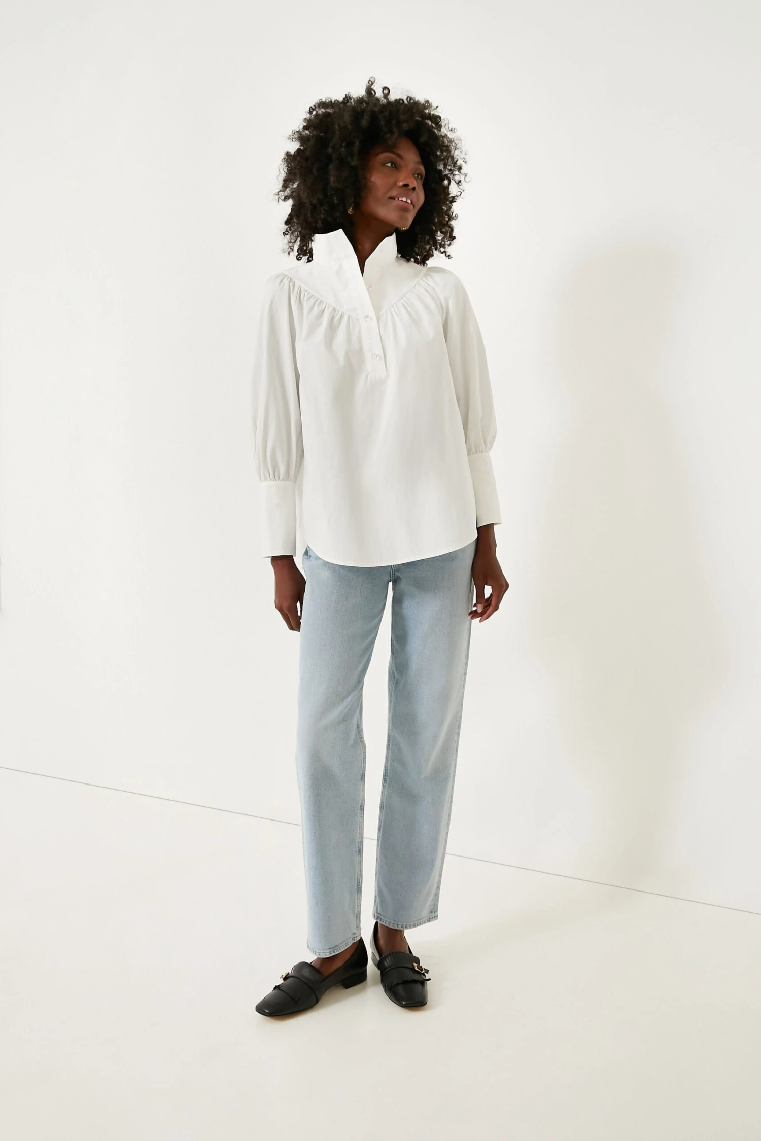 The White Corrigan Blouse is the top that will instantly refresh your wardrobe. This updated classic features a stand collar with a quarter length button front placket and long cuffed sleeves for a chic, modern look. We love wearing this for an easy desk to drinks look, swapping from flats to heels and adding gold accessories for a dash of subtle glam.