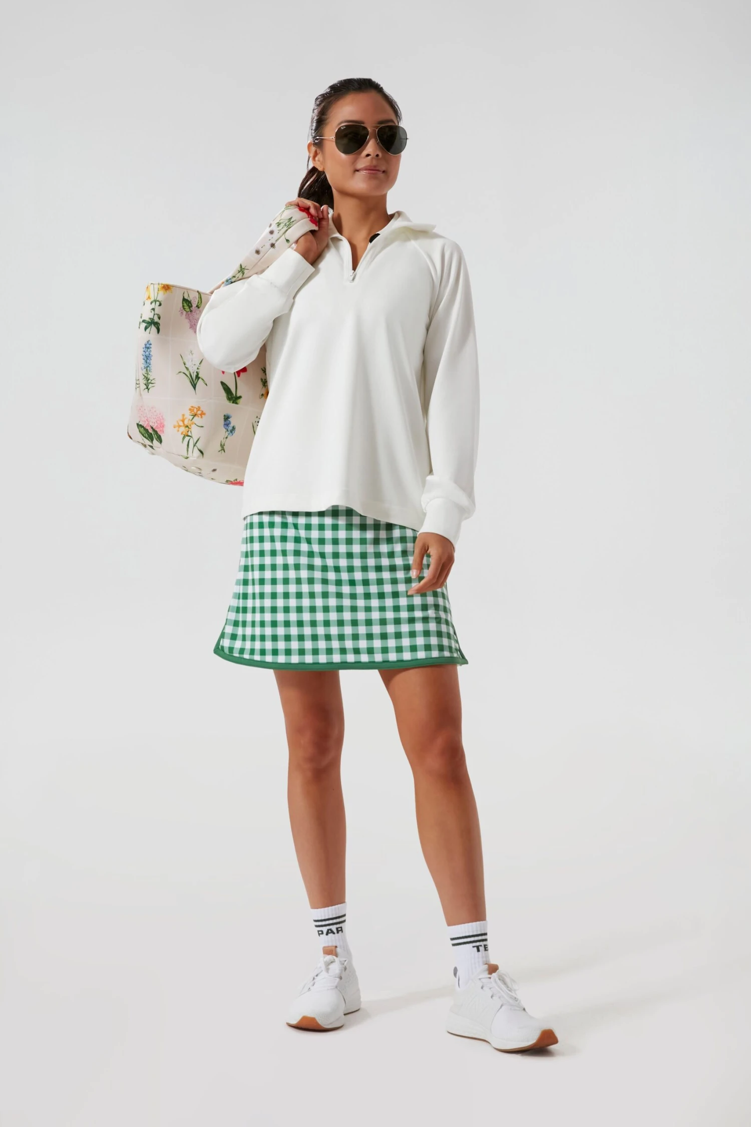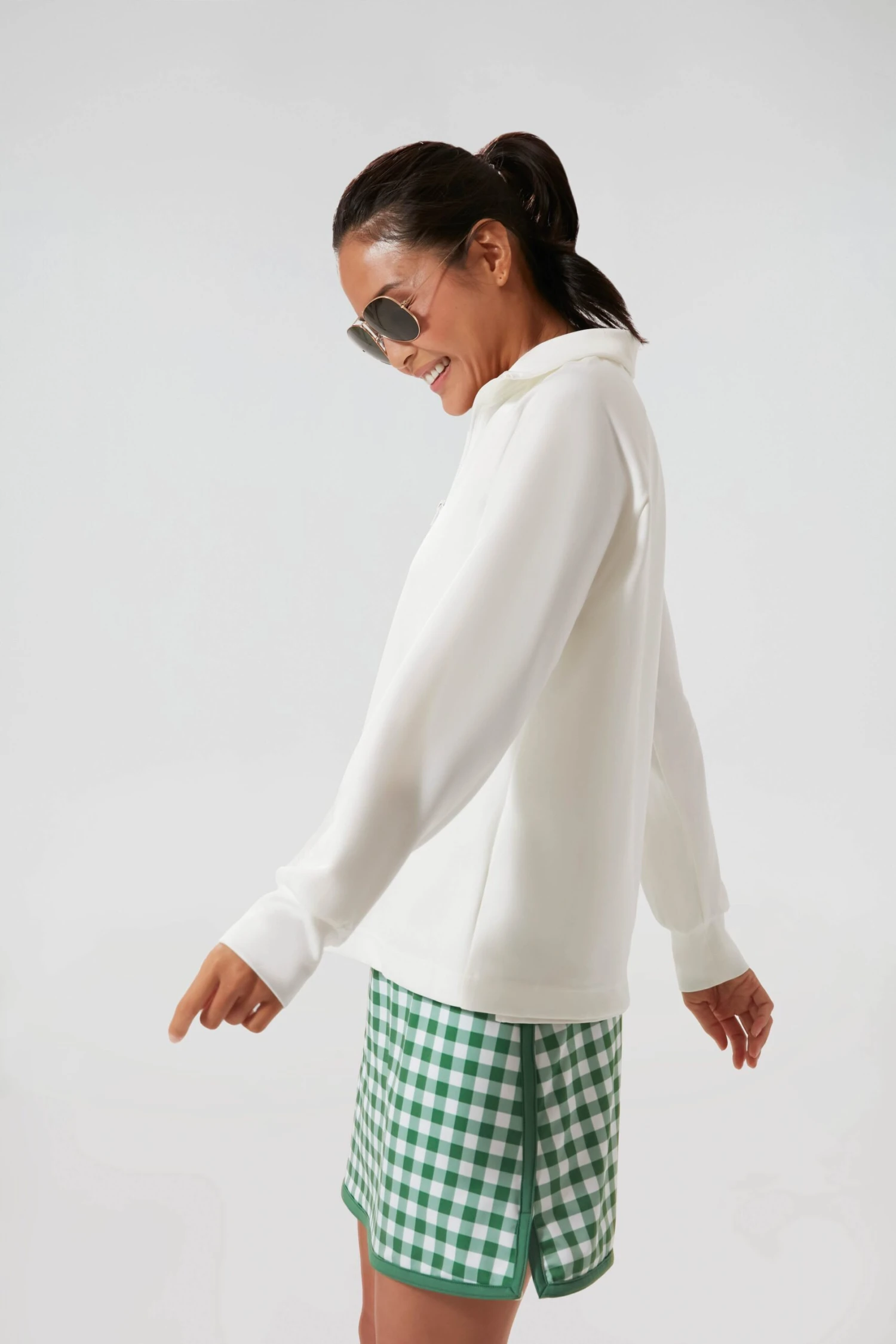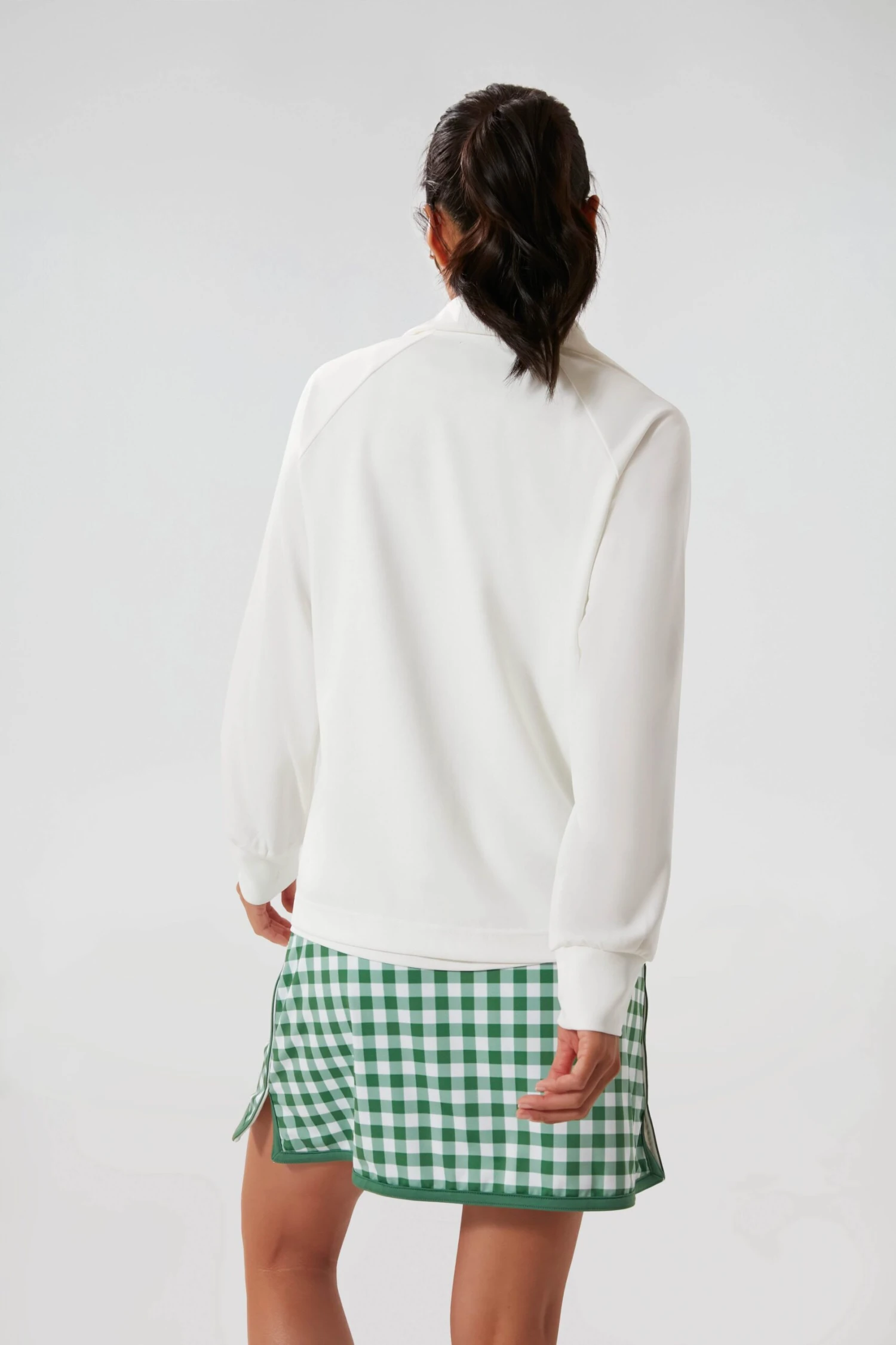 Crisp, cool and a completion to any look, the White Quarter Zip plays just as well over a performance tee as it does draped over your shoulders. The stretch fabric combined with the boxy shape makes for the perfect warm-up or cool-down piece. We’re looking at you, post-match margaritas!