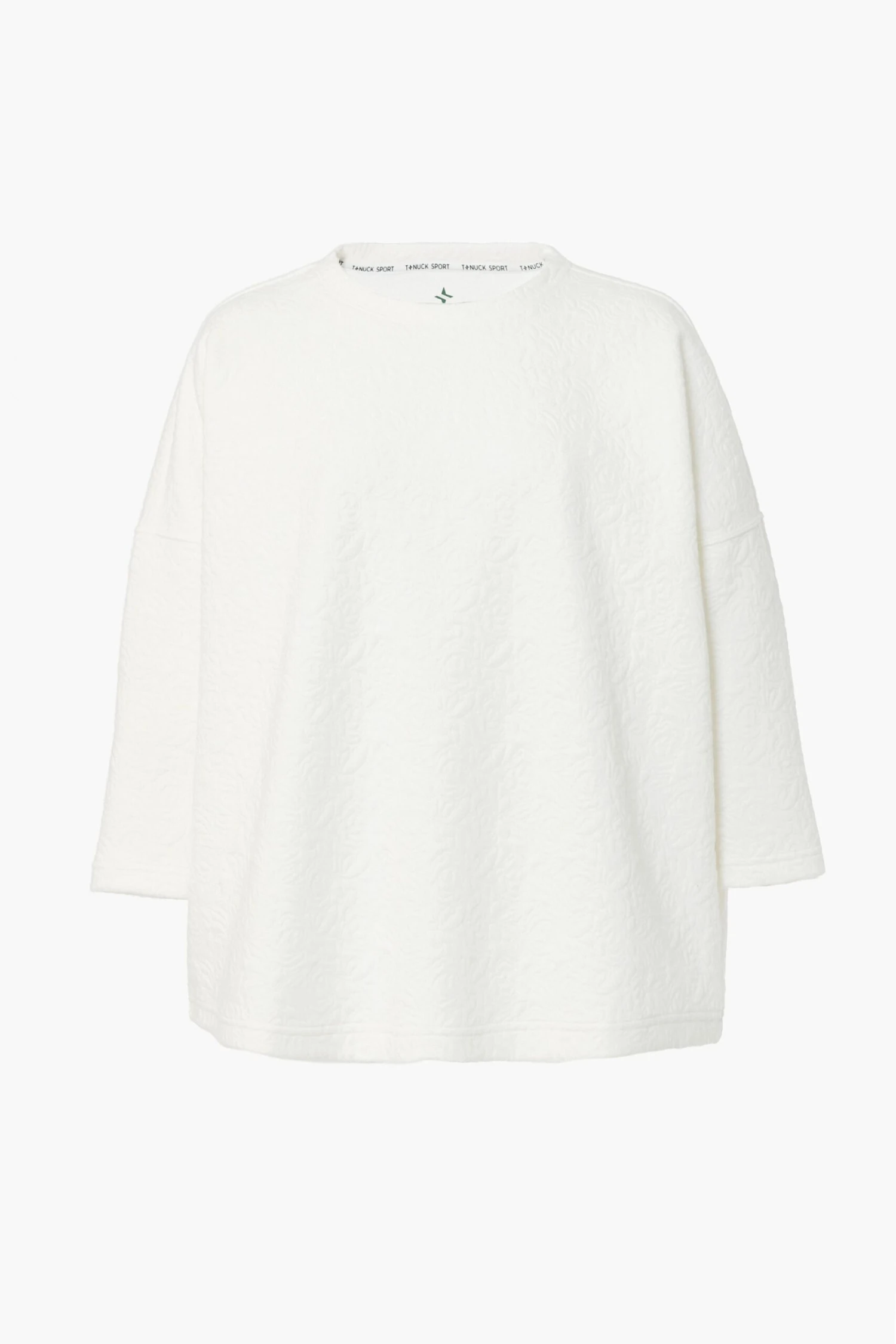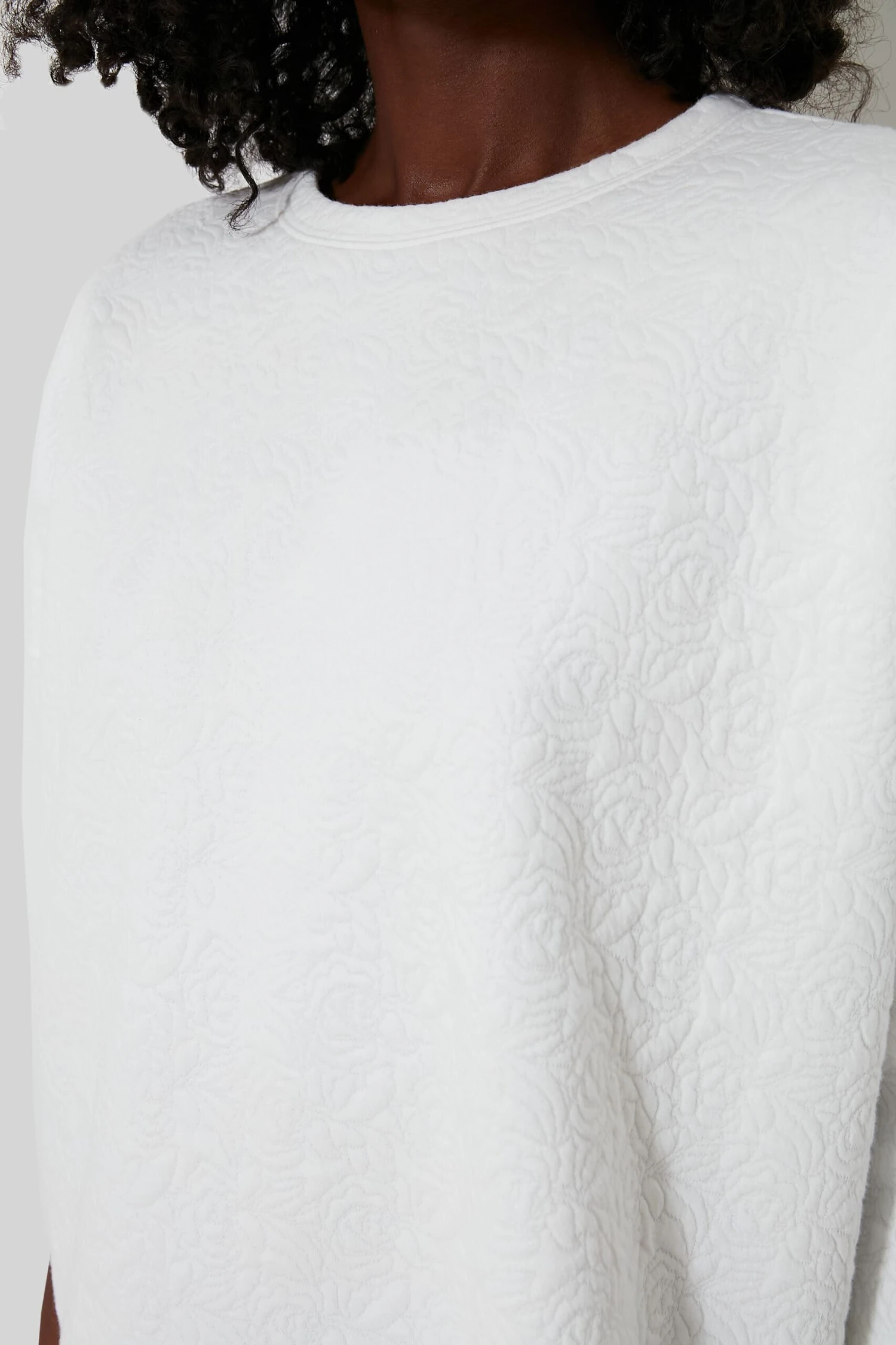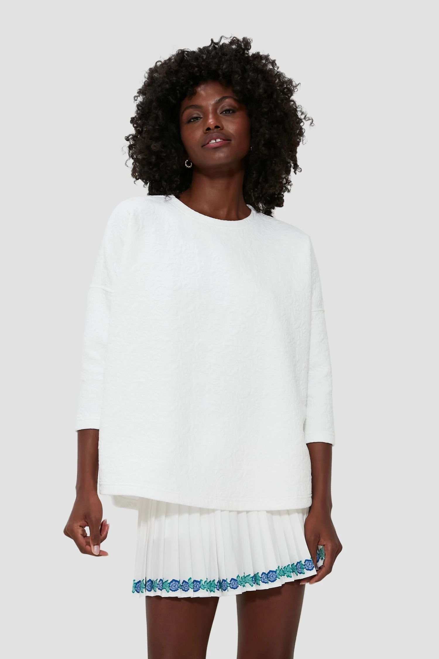 Zoom in to see the beautiful jacquard inspired fabric that decorates the White Quilted Paisley Ally Swing Sweatshirt. The perfect outfit topper to take you from a warm-up run to a coffee run, this easy and elevated style was designed with mobility in mind. Soft-to-touch, this is a best-selling silhouette thanks to its luxe floral print, fitted sleeves, and swing shape body that pairs perfectly with leggings, shorts, and performance skirts for an all-activities piece.