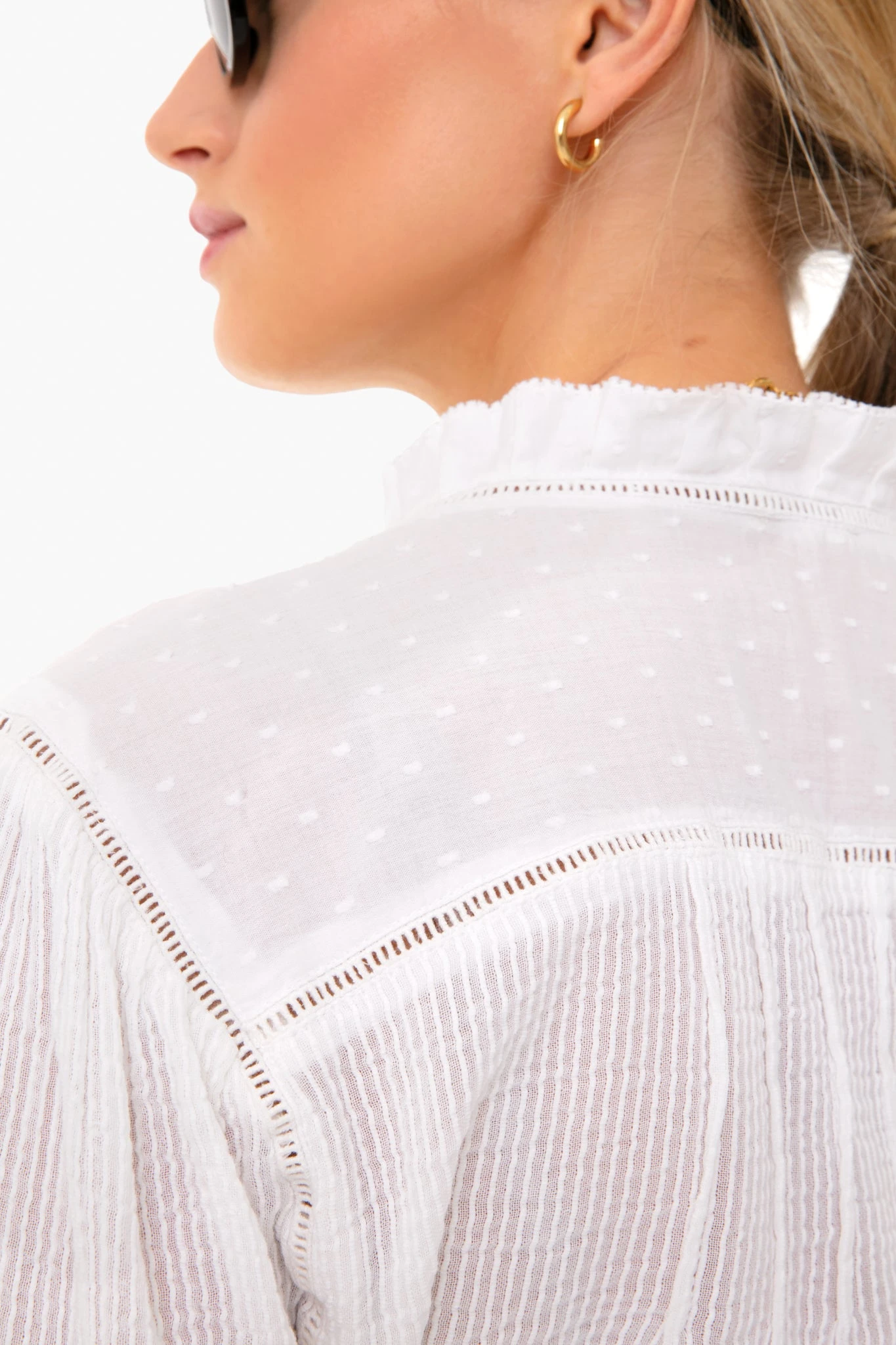 Embrace casual bohemian vibes in this peasant style blouse. The White Willa Top features romantic blouson sleeves and delicate embroidery along on the neckline and chest, exuding laid back femininity. Pair with denim and flats for a casual weekend look, or style with shorts and sandals for fun in the sun.